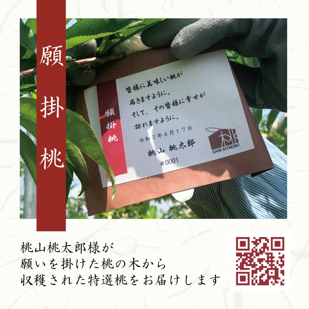 「願掛袋」が掛けられた桃そのものをお届けするのではなく、「その袋が掛けられた木」から収穫された桃をお届けすることになります。桃の木になる桃のすべてが出荷基準に達するわけではなく、桃の木1本から採れる「特選桃」は更に 数が限られるからです。まず、美味しいことが大前提であると考えています。皆様の願がかかった「桃の木」から最上級の美味しい桃を選別してお届けいたします。