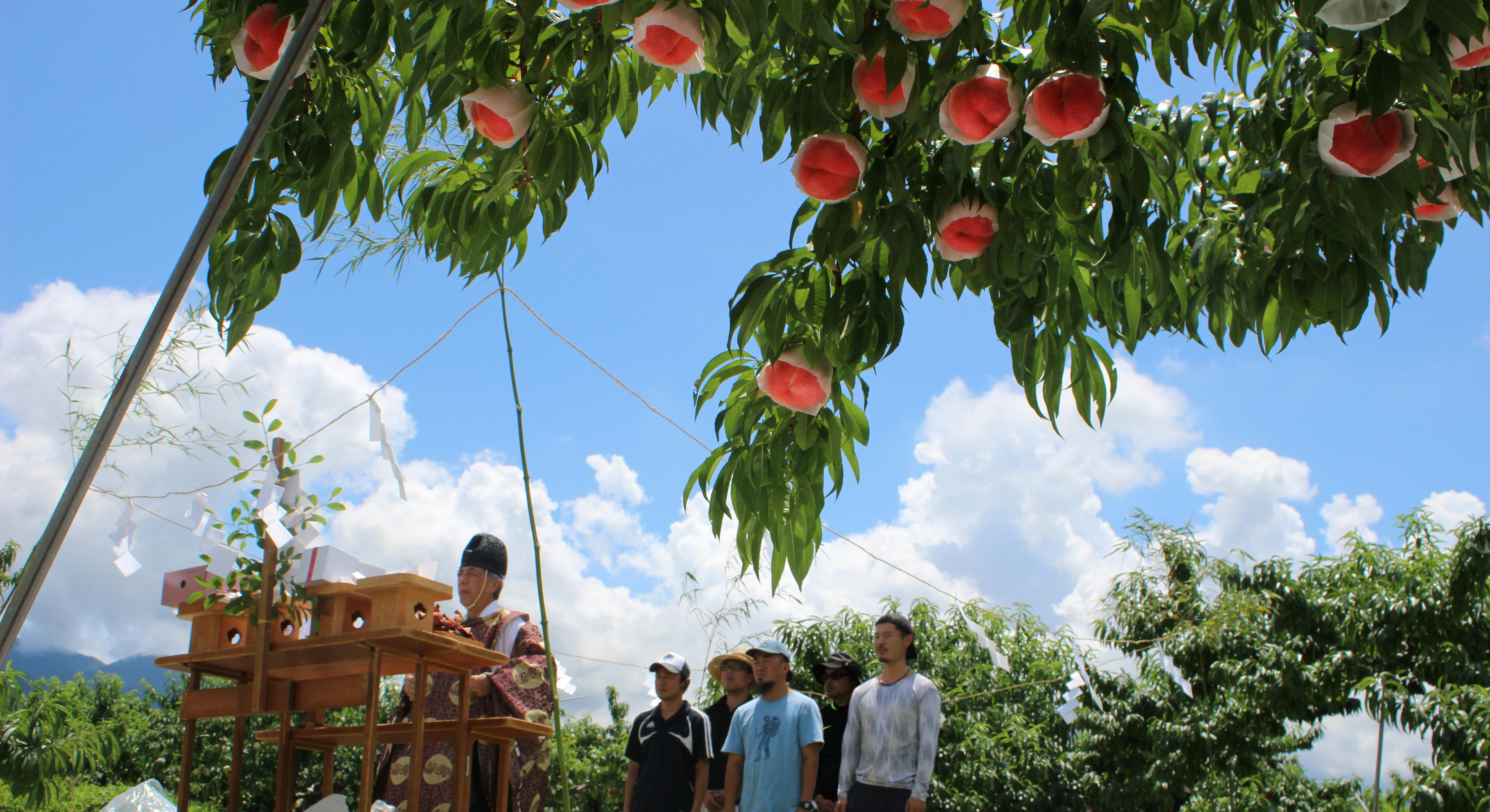 「願掛桃」では、地元の神社の神主様に桃畑においでいただき、無事に桃が育成したことへの感謝の意と、皆様の願いが無事に叶いますように「お焚き上げ」の儀を行っていただきます。