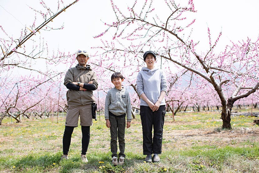 山梨では5月下旬から6月上旬にかけて「果樹袋かけ」という農作業が行われます。目的は防虫・病害・獣害などから大切な桃の実を守るため。農家は厄除けにも似たこの農作業を、桃が無事に育つよう願いを込めながら、毎年、何千~何万枚という袋を桃にかけています。