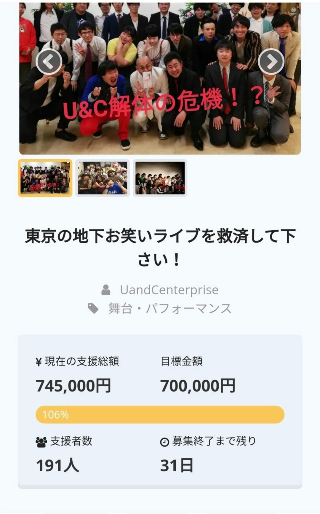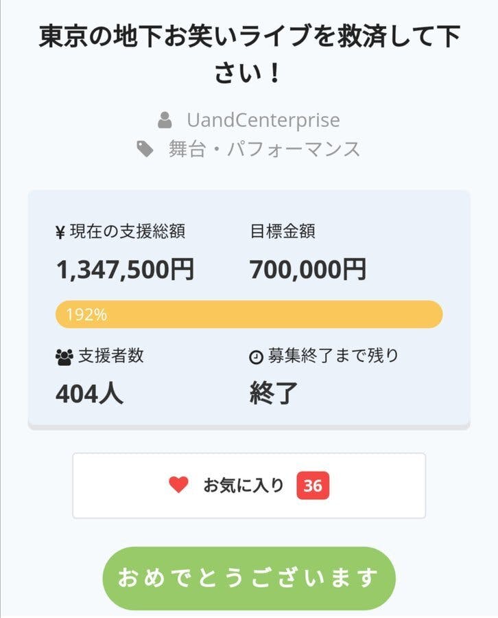 2020/04/25 20:31こんばんは、U&Cエンタプライズしぶやです。今日初めて投稿致しました。4/22(水)12時からクラウドファンディングを始め、その日のうちに目標金額の70万円を達成しました。ありがとうございます!Twitterの反応を拝見したところ驚かれている方が多かったですが、誰よりも驚いているのはこの私です。本当にありがとうございます!!!沢山の魅力的なリターンは芸人さんの力によるものがほとんどで、U&Cのライブは魅力的な芸人さんと、その芸人さんを応援する温かいお客様に支えられているのだと再認識致しました。ここで皆様にお願いです!第一目標の70万円は、5月末までの会場キャンセル代に充てるものでして、それ以降もキャンセルが続いた場合は毎月数十万円ずつ増えて行ってしまいます。現状、どうなるかわからないですし、早くも年末のイベントをキャンセルされいる方もいるそうです。もちろんこちらの予約に関しては私自身の意思で行ったもので、本来は私自身で払うべきものだと思っています。しかしライブもできず、バイトもお休みになってしまい、当面の間は収入が得られません。(区の機関に相談には行っています。) 復活までもう少しのご支援をいただけますと助かります!もし早めにライブが復活できるようになりましたら、余剰金は芸人さんのライブのギャラや、ケータリング、スタッフへの謝礼に使用させていただきます!!クラウドファンディングの期間はあと1ヶ月近くありますので、コロナやU&Cの休止状況等で、追加支援をご判断いただけますと幸いです。図々しいお願いではありますが、芸人さんが立てる舞台を絶やしたくないので、どうかお願い致します。本当に皆様ありがとうございます!早く皆様の笑顔に会えますように! もっと見る