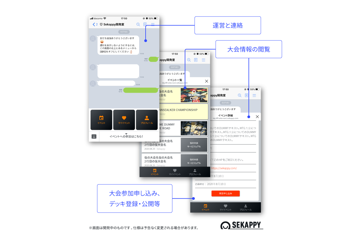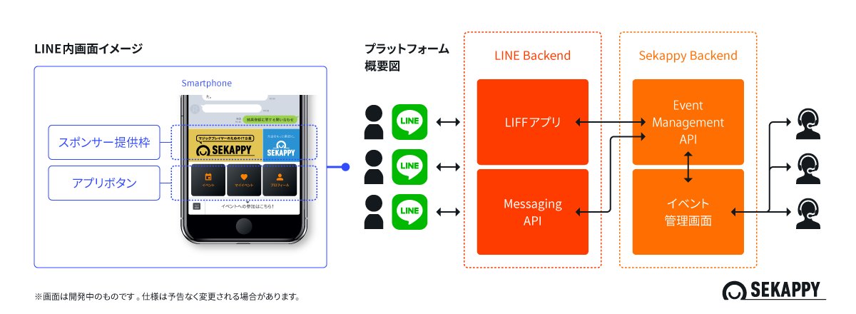 ●本プラットフォームは、「シャドナビ」や「ブシナビ」でも利用しているSekappy所有の大会システムエンジンを土台にさらなる拡張を加え、LINEプラットフォーム(※)と連動することで実現させます。