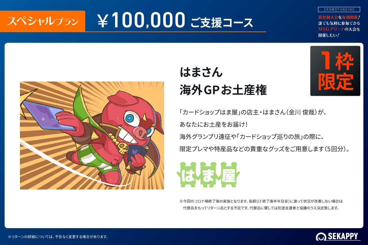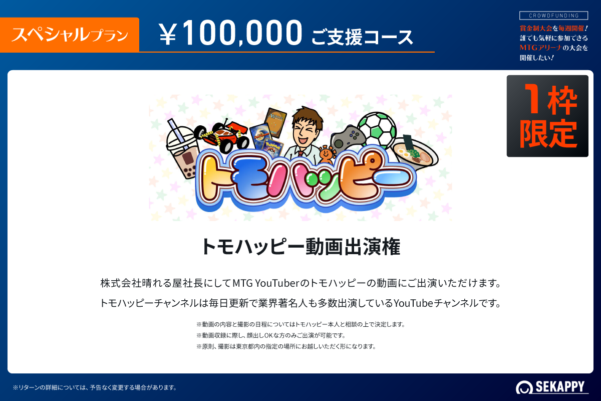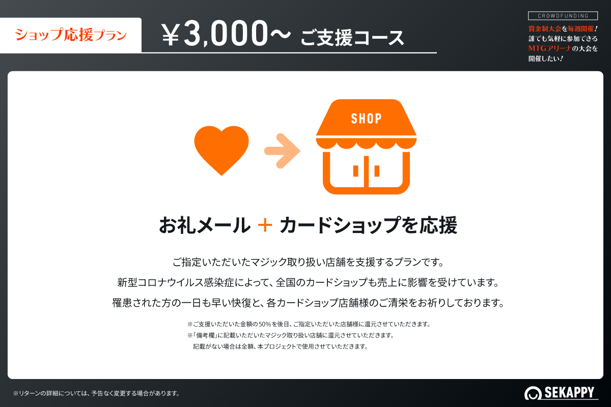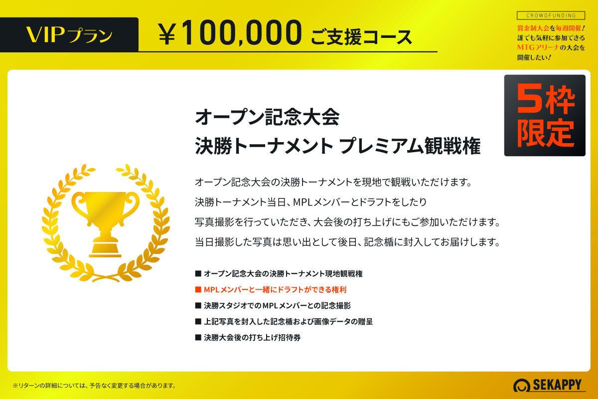 私たち株式会社Sekappyでは、賞金制大会の運営にご賛同いただけるスポンサー様を募集しております。私たちは、マジック:ザ・ギャザリングとeスポーツの未来を見据え、その可能性を大きく広げることを目的としています。