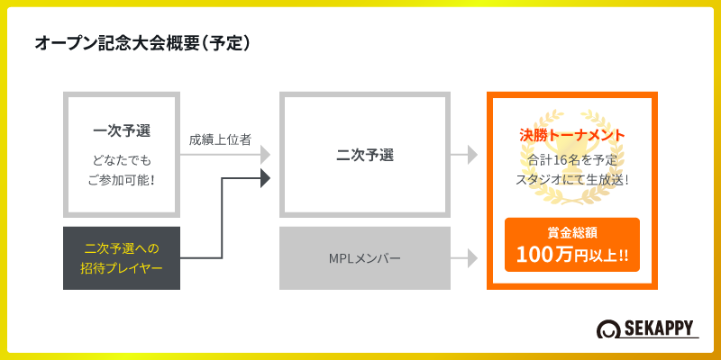 賞金総額は100万円以上(変更になる可能性があります)で、MPLプレイヤーたちも参戦する豪華なトーナメントです。この「オープン記念トーナメント(仮)」にはどなたでもご参加いただけます。