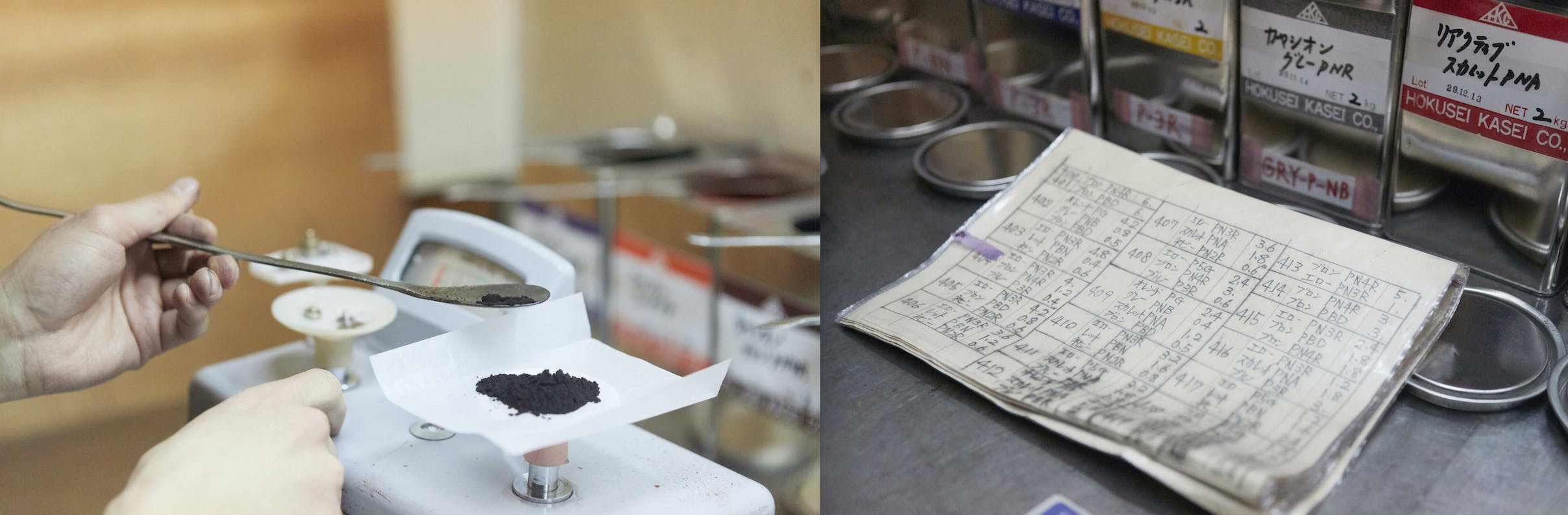 細かいミリグラムまで正確に計る為に、今も分銅を使って計っています。