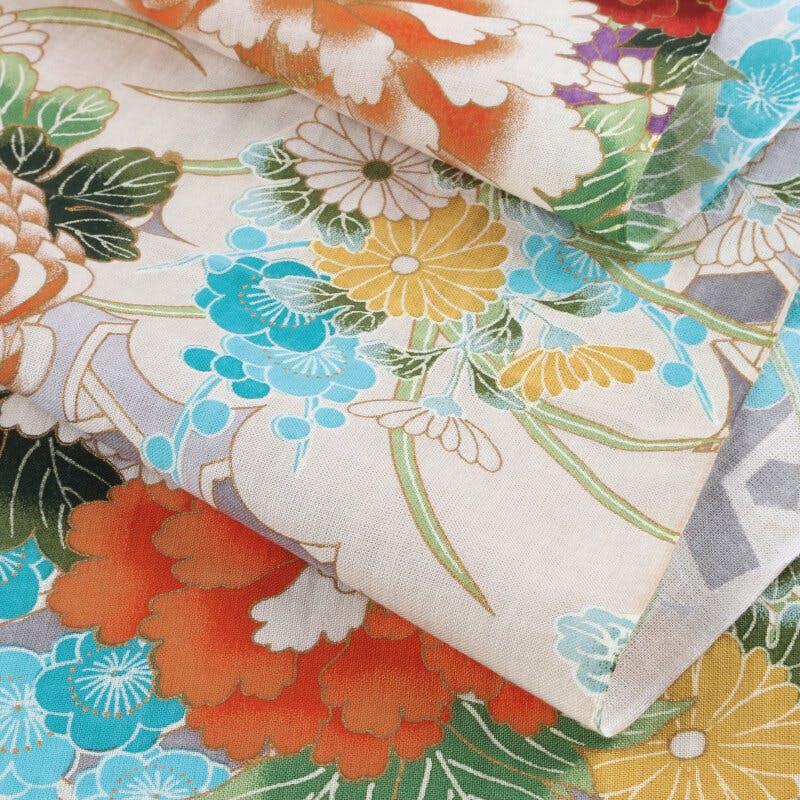 白象をはじめとした愛らしい動物たちが「桝目描き」と呼ばれる特殊な描法で描かれるこの柄は若冲の独創性が感じられる作品として注目を集めています。桝目描きと呼ばれる、タイルのような表現技法は友禅染めでは抜染技術を使うことで表現しました。型枚数23枚に及ぶ大作になりました。23色の染料を使い染めています。