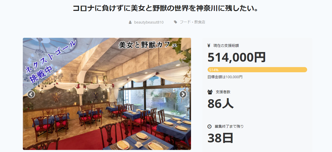 2020/05/04 18:08◆目標達成皆様のご支援ご協力に支えられ、開始1日という日数で目標の金額を達成することができました。本当にありがとうございます。現在も支援してくださっている皆様、心よりお礼申し上げます。リターンは6月の募集締め切り後、順次発送させていただきます。その際メッセージでご住所をお聞きする事もあるかと思います。よろしくお願いいたします。◆ネクストゴールについて自粛延長が囁かれる中、私共はまずお店を残し、そしてお店を開けてもコロナの影響を受ける前と変わらずおもてなしができるよう万全の体制を整えたいと思っております。しかし現段階のままですと、・従業員のシフト、又は人員そのものを削らざるを得なくなる・お店を残す事に注力するため、余裕の出るまではロスを無くすために数点のメニューでのご提供・営業日数の減少等を想定しなければいけないと思っております。お店を残し、自粛が解除され、その時にいち早く皆様の癒しや憩いの場となれるよう尽力を尽くさせていただくためにネクストゴールを第二の目標として掲げさせていただきました。ネクストゴールは100万円です。この金額があれば従業員は誰も欠けることがなく、店の存続は保証され、料理の質も種類も保たれることがお約束できます。引き続きのご支援、ご協力どうかよろしくお願いいたします。 もっと見る