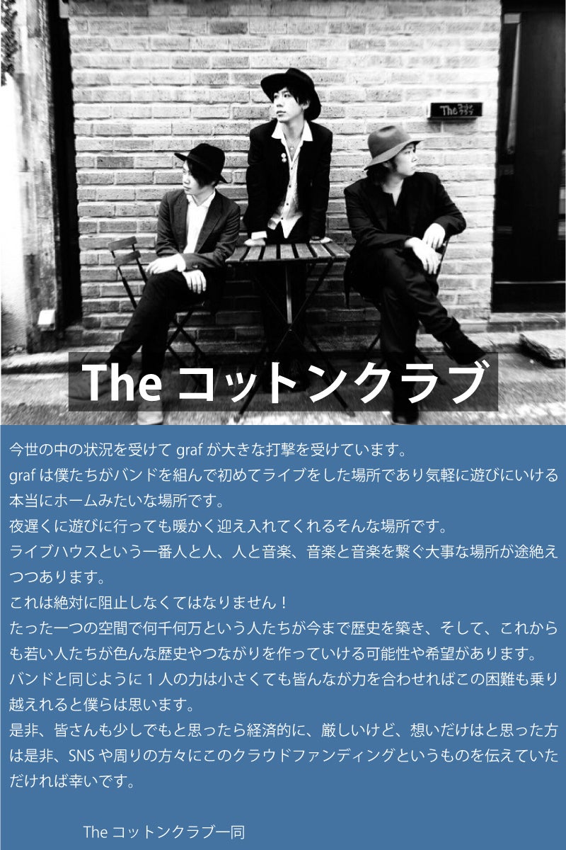 コロナが収束したら、またgrafで全国のライブハウスで素晴らしい音楽が鳴り響く日々を強く願っております。そのために準備を進めてまいりますので何卒、応援を宜しくお願い致します。