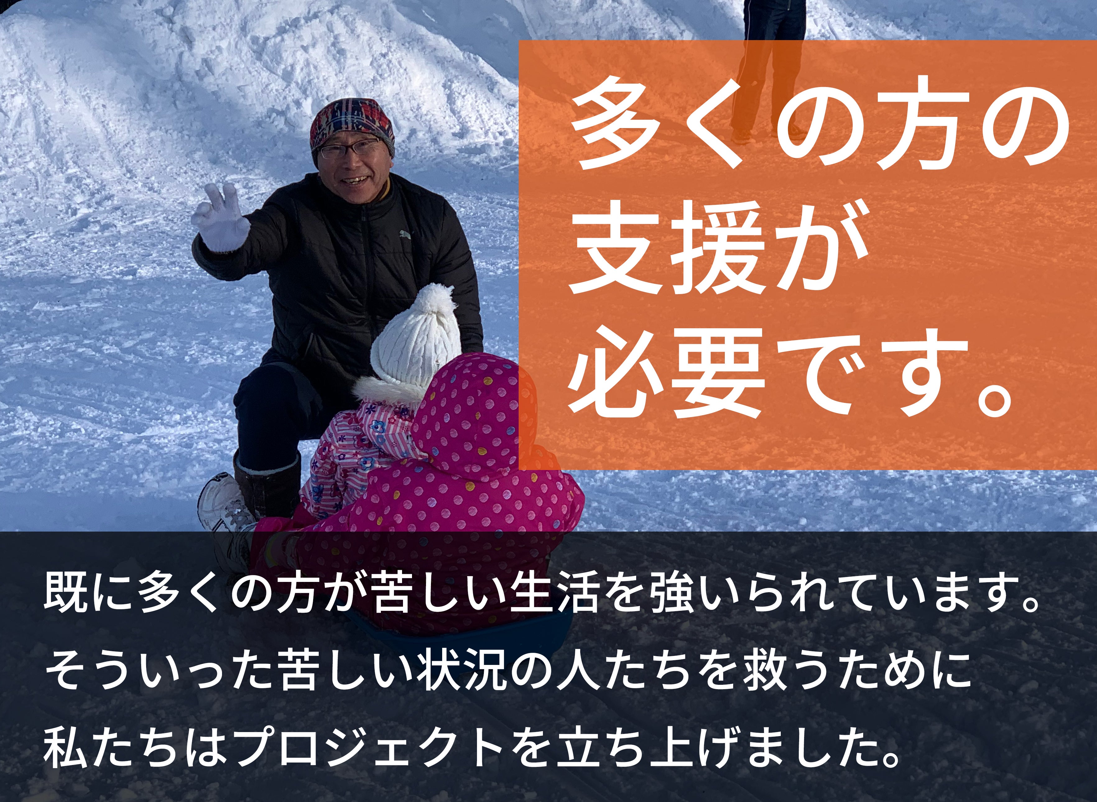 この新型コロナウィルスの非常事態において支援を必要とする方々のために、皆様⽅の資⾦⽀援をどうかお願いいたします。