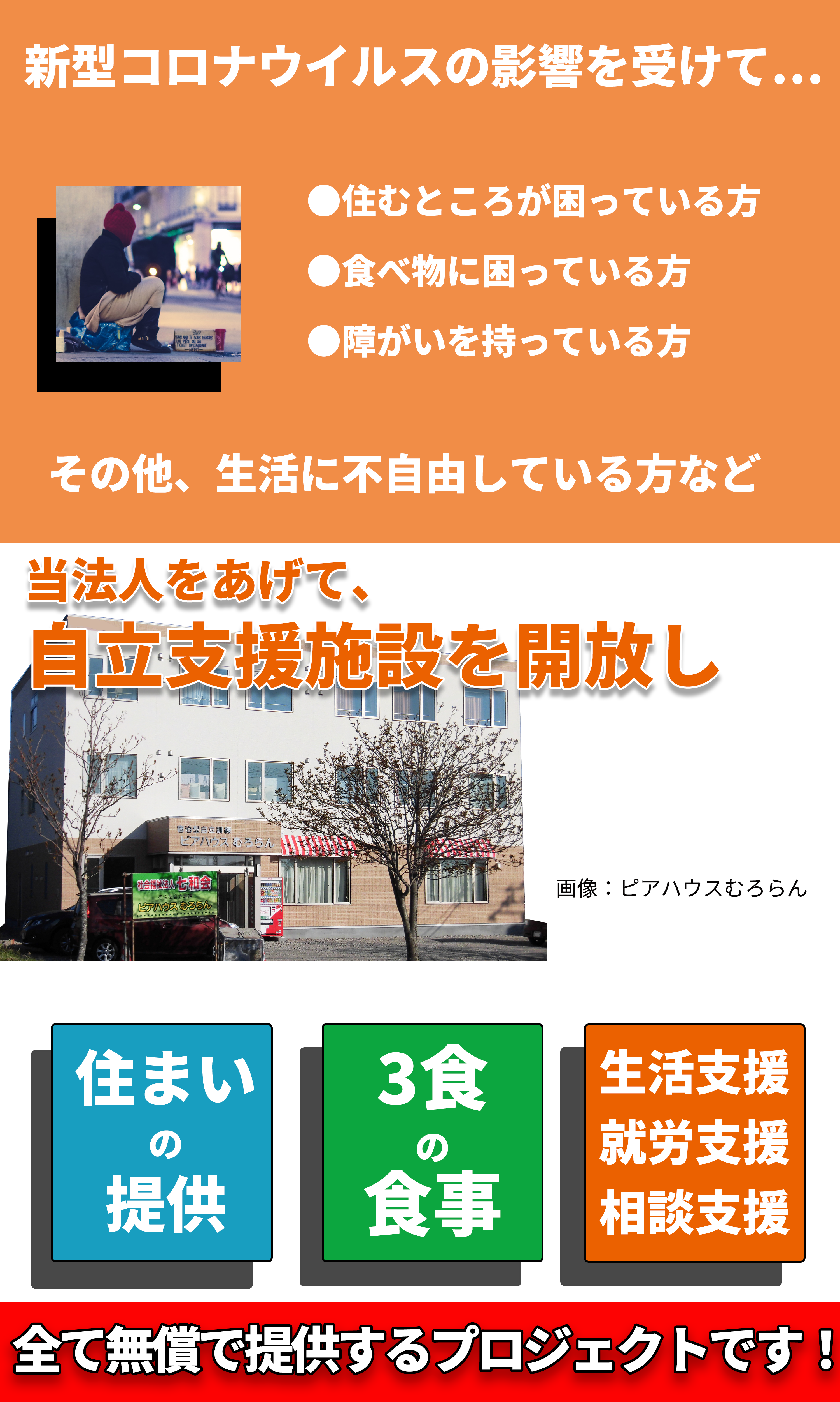 今回、新型コロナウィルスの充満により非常事態宣言が出され、住まいを失ったり職場を失うなどの生活困窮者が増大しております。そういった生活困窮者の方々のために、住まいの提供や食事の提供、就労支援といった施設をあげての自立支援活動をおこなっています。