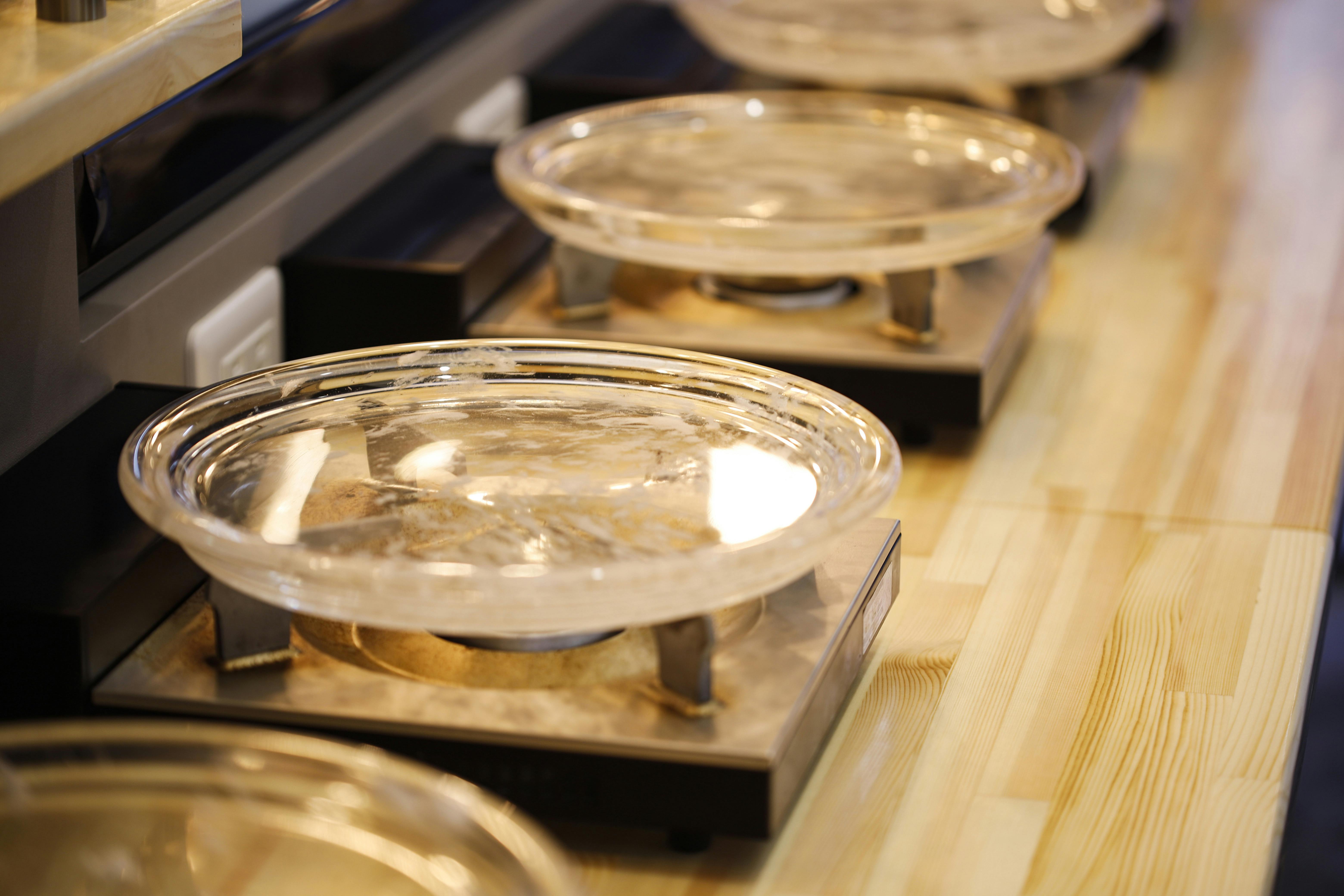お米は「ゆめぴりか」を使用していまして、これに卵かけ専用の卵を使用した「たまごかけごはん」も人気です。ドリンクはセルフなので自分でサーバーからジョッキに注ぐスタイルです。サワーやハイボールも同様にセルフになり皆さん楽しんで注いで頂いています。水晶板の特徴が①煙が出にくく匂いが付きにくい②遠赤外線効果でお肉がふっくらと焼ける等の特徴があります。
