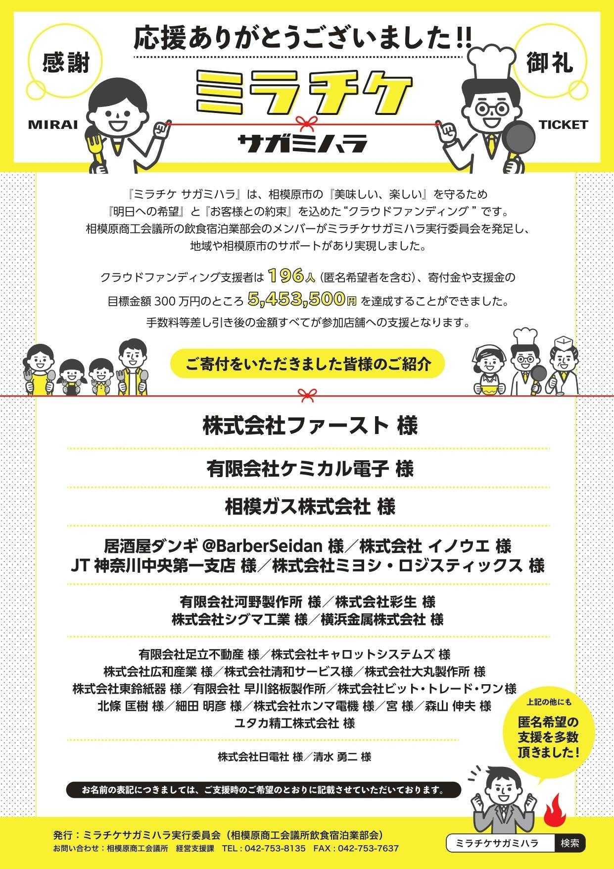2020/06/25 13:56【ご支援・応援いただきました皆様へ】この度は「ミラチケサガミハラ」のプロジェクトに対しまして、温かいご支援をいただき誠にありがとうございましたm(__)m私どもの活動にご理解いただき、ご協力いただいた皆様に関係者一同、深く感謝しております(*^_^*)また、多くの皆様にご支援頂きましたおかげで、なんと、総額5,453,500円を集めることができました!当所の目標を大きく上回る結果に、皆さまの相模原への深い愛情と、熱い思いを感じております。皆様から頂いたこの感動とご厚意を糧に、必ずやコロナ禍を乗り越えていきたいと存じております!!!さて、今後についてですが、食事券購入型でご支援を頂いた皆さまには、ご指定いただいた店舗で使える食事券の発送をさせていただき、寄付型でご支援を頂きました皆さまには、弊所ホームページや、関連施設、参加店舗にてポスター等でお名前の掲示をさせていただきます。また、寄付型でご支援を頂きました方への、「ありがとうディナーバイキング」の企画も順次進めて参ります。これら、ご支援に対するリターンのスケジュール感は以下の通りとなりますので、ご確認をいただけますと幸甚です。=================================================《食事券購入型のリターンの内容とスケジュール》◇リターンの内容・支援金額に対し10%のプレミアム付き食事券をお届けします。・食事券は500円券、100円券等ご利用しやすい形でお届けを致します。・食事券の有効期限は2020年8月1日~2021年1月31日を予定しております。◇発送時期・2020年7月下旬予定(郵送にてお届け)《寄付型のリターンの内容とスケジュール》◇リターンの内容相模原商工会議所会報誌・ホームページ、また、市内各所や参加店舗にて支援者様のお名前を掲示させていただきます。◇スケジュール2020年8月1日~2020年11月末日(予定)=================================================以上のような形が今後の流れとなりますが、各種リターンを実施させていただく際には、改めてご報告致します。今後とも、市内飲食店に対しまして末永いお力添えを頂きますよう宜しくお願い申し上げます。最後になりますが、多くの感動とご厚意、本当に、本当にありがとうございました!!!! もっと見る
