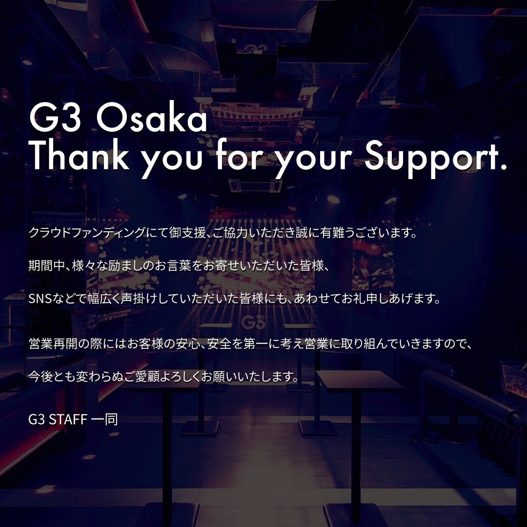 2020/05/28 15:00この度はG3のクラウドファンディングにご支援いただき誠にありがとうございます。皆様のご支援と励ましにより6月5日(金)より、GIRAFFE JAPANにて営業を再開する運びとなりました。お客様への安心・安全を第一に考え感染拡大防止にむけた取り組みを徹底した営業を心がけて参ります。自店G3での営業再開に向けて段階的に進めていく予定ではございますが緊急事態宣言の延長に伴い当初の予定より遅れてのスケジュルーとなっております。ご支援いただいたリターンに関しましても6月を予定しておりましたが、7月予定と変更させていただきます事をご理解、ご了承の方宜しくお願い致します。G3での営業再開の方は日程が確定次第、改めましてご報告の方させていただきます。株式会社First DreamG3 代表取締役 藤原大輔従業員一同【店舗アクセス】〒542-0084大阪府大阪市中央区宗右衛門町7-7 ムーンライトビル (リバーウォーク側がエントランスです)電話.お問い合わせ : 06-6214-0798電話応対受付19:00-25:00(GIRAFFEJAPANとの合同営業期間中)G3自店での営業再開時は変更になります。 詳細はG3ホームページ 各種SNSにて随時発表していきますので宜しくお願い致します。G3ホームページG3 InstaglamG3 twitter もっと見る