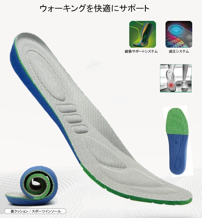 歩行や軽いランニングに適したインソールがセットされています。足に掛かる負担を大きく軽減する為にスポーツタイプを特別にセットしました。