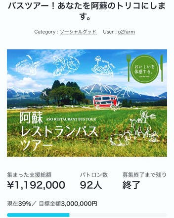 2017/05/18 09:23《クラウドファンディング終了のお知らせ》 2017.4.3よりスタートしたクラウドファンディング、『阿蘇の農家がプロデュースするレストランバスツアー!あなたを阿蘇のトリコにします。』は、昨日2017.5.17 23:59を持って終了いたしました。https://camp-fire.jp/projects/view/26090 みなさまからのご支援いただいた総額は、¥1,192,000という結果となりました!! 全国から92名もの方々より、あたたかいご支援をいただき、本当に感謝の気持ちでいっぱいです!! 目標達成には至りませんでしたが、それ以上にみなさまからの応援がわたしたち農家の背中を力強く押してくれて、そして励みとなっております!! 集まった支援金は、「この風景を守りたい」という根底にある想いからはじまった『レストランバスツアー熊本』の活動資金へとあてさせていただきます。 そして、みなさまにお選びいただいたリターンにもおひとりおひとりに心を込めてお返しができたらと思っておりますので、しばしお待ちください。 あたたかく心強いご支援、みなさま本当にありがとうございました!今後とも応援をよろしくお願い致します。 大津愛梨 もっと見る