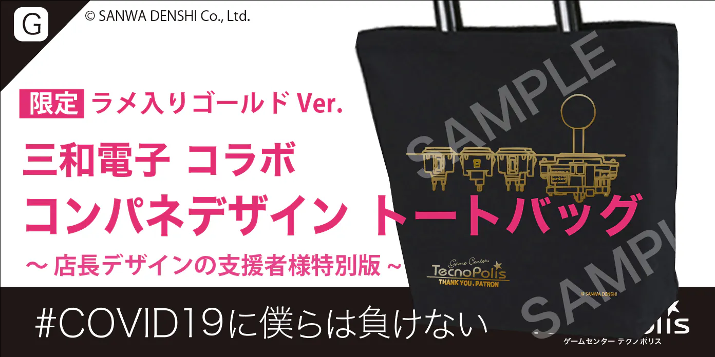 ②の内容(+店内壁面掲示)+コンパネデザイン特製トートバッグ(三和電子コラボ/ゴールド色プリント)を発送にてお届けさせていただきます。このカラーは高コスト製造なので今回限り限定品です。