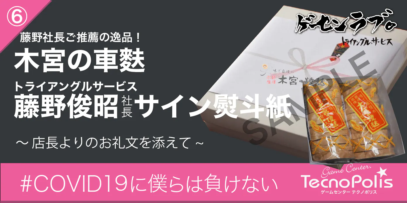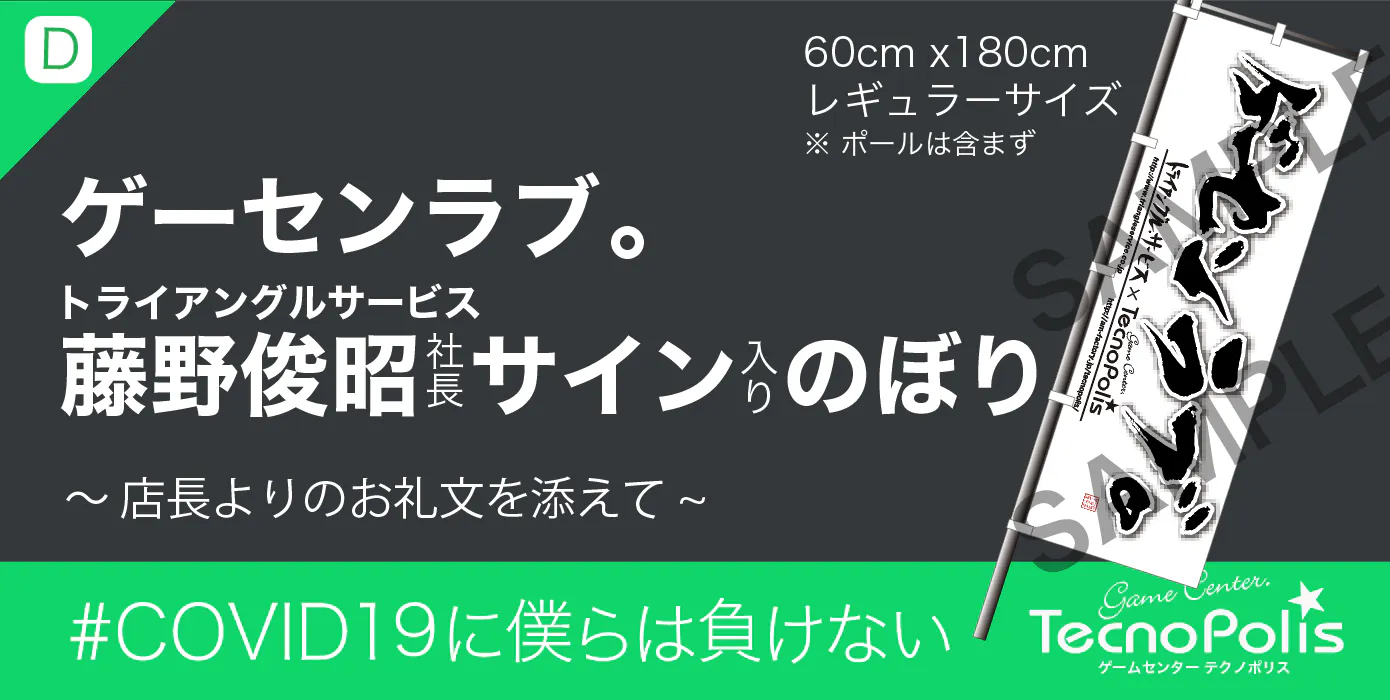 ②の内容(+店内壁面掲示)+トライアングルサービス藤野社長*1の直筆サイン入りのゲーセンラブ 。コラボデザインのぼり(レギュラーサイズ 60cm x 180cm)を発送にてにてお届けいたします。