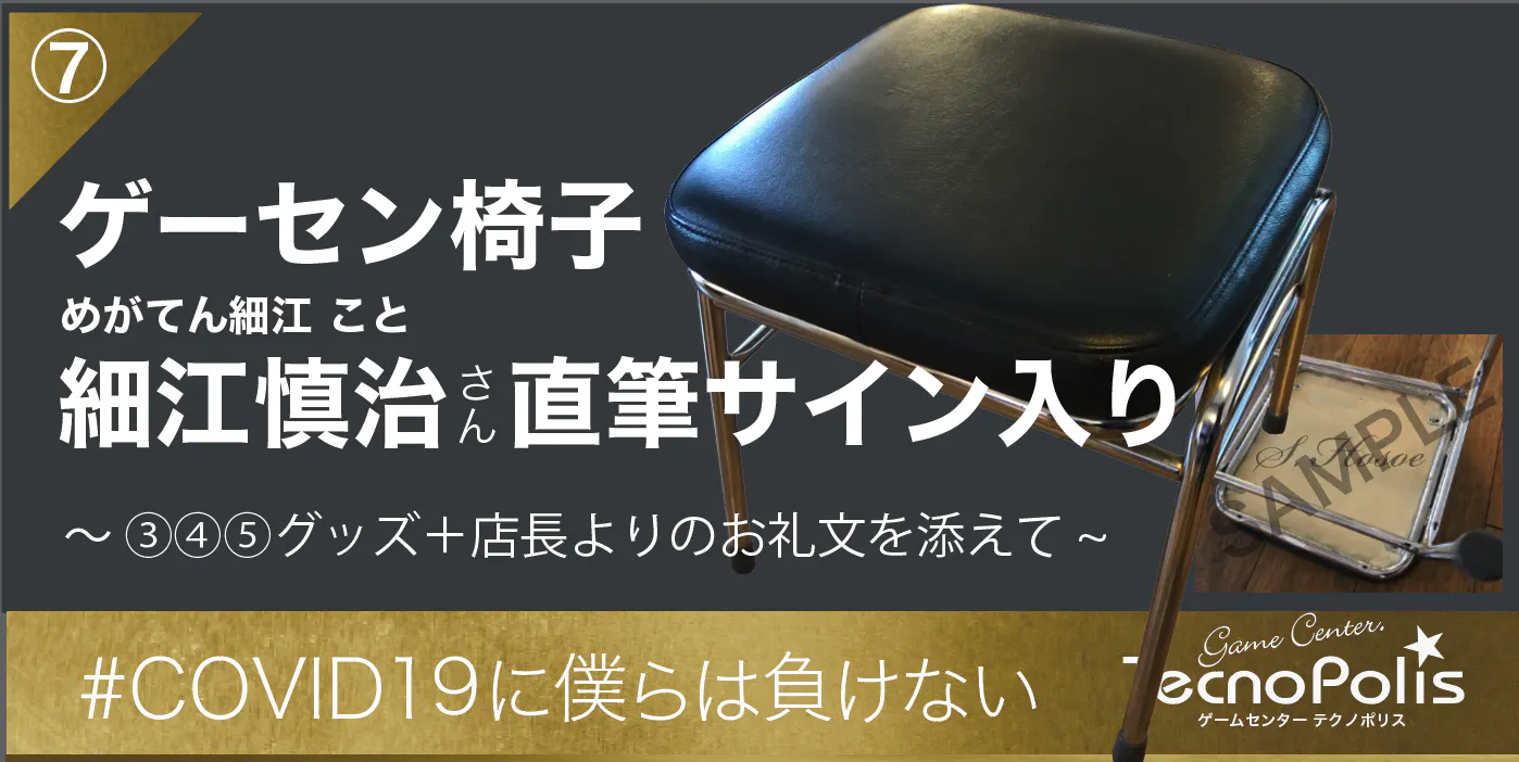 ②の内容(+店内壁面掲示)+③〜⑤の商品+スーパースィープ 細江慎治*2さんの直筆サイン入りのゲーセン椅子(特注品・当店やタイトー直営店でも利用中の本物)を発送にてお届けします。