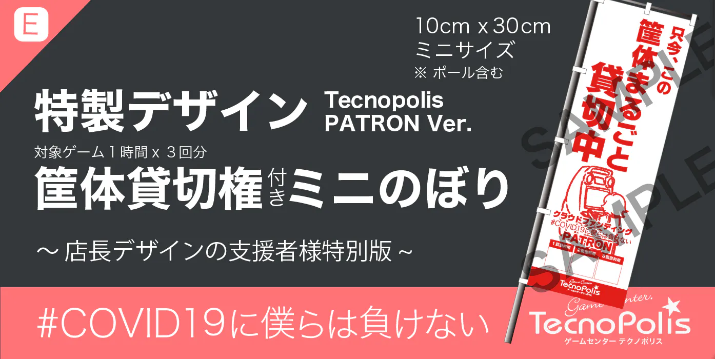 ②の内容(+店内壁面掲示)+オリジナルデザイン特製ミニのぼり(対象ゲーム機筐体の1時間x3回貸切権利付き)を発送にてお届けさせていただきます。