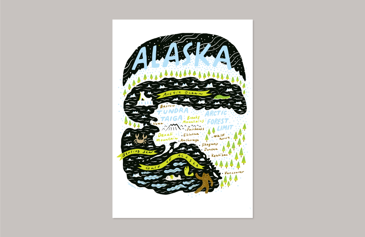 普段まったく絵を描かない代表山川が描き下ろしたイラストです。スタッフで一枚ずつ手刷りします。