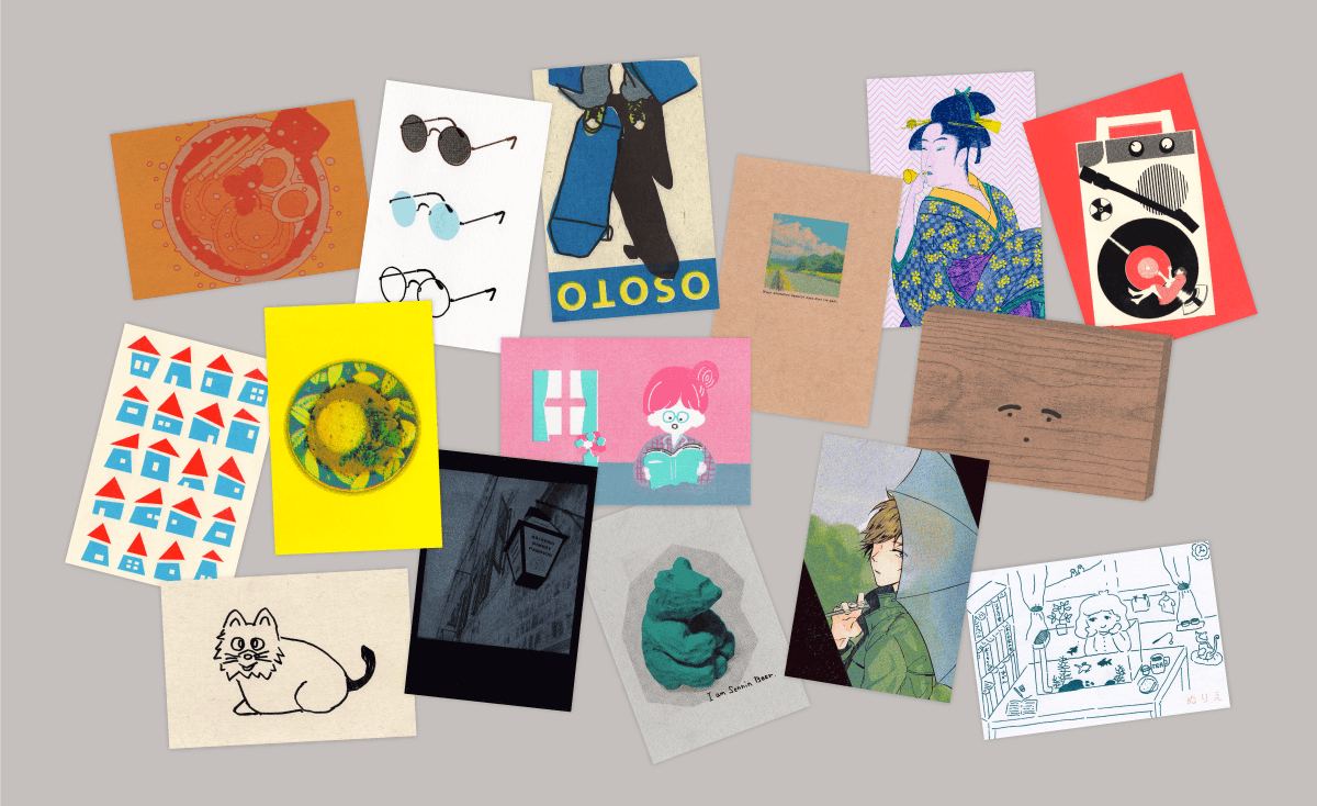 スタッフそれぞれが作成したポストカードです。リターンでは約30種類の中から4種類をお届けします。