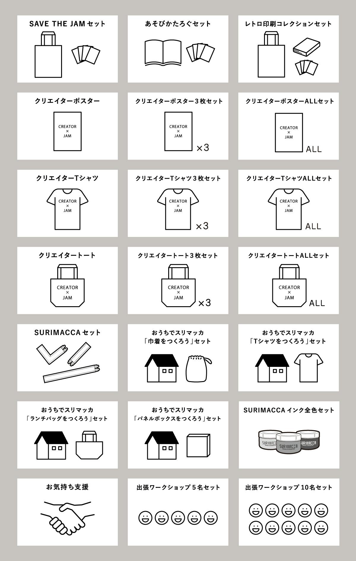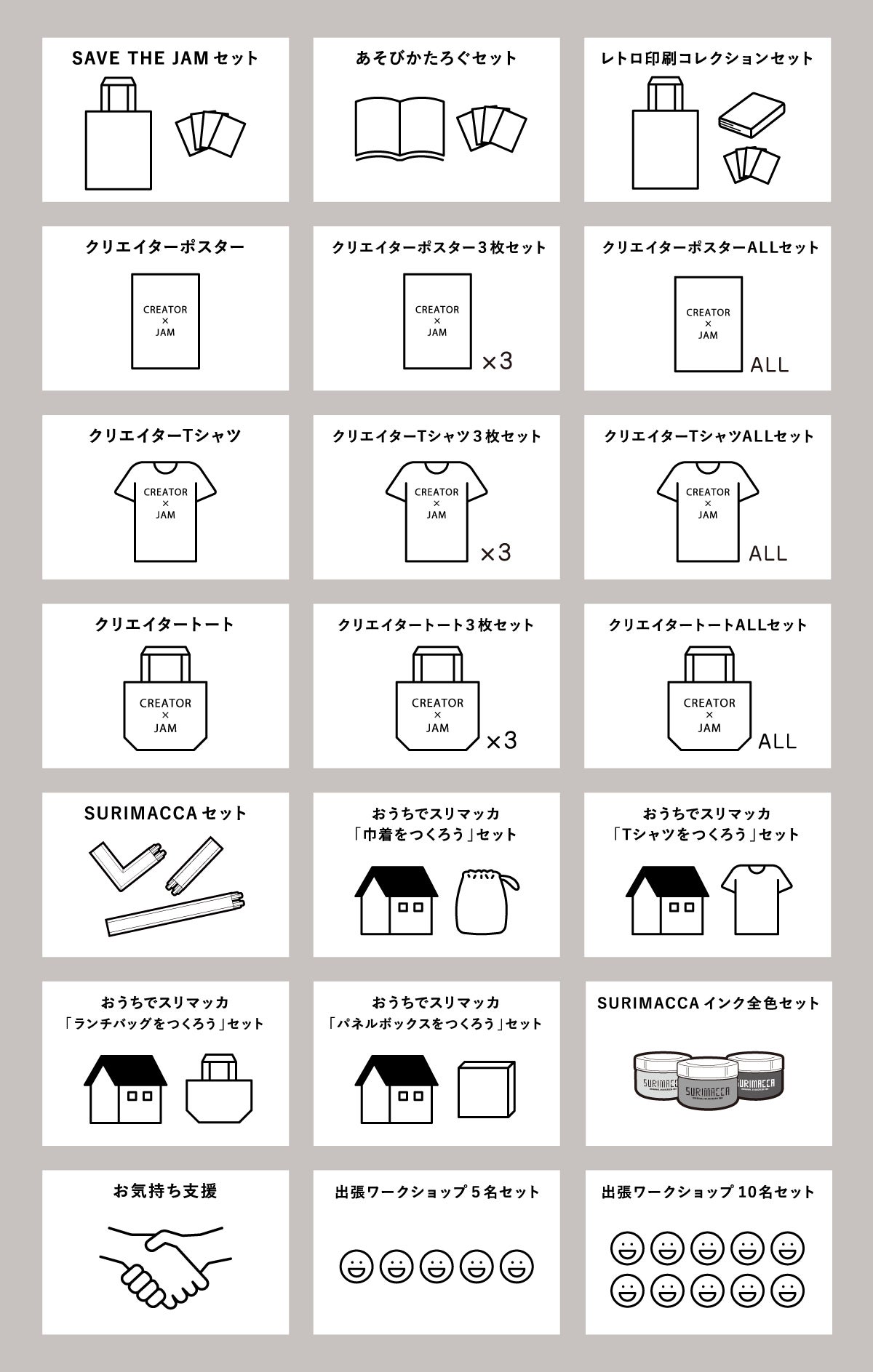 2020/06/11 15:41【SAVE THE JAM - 「印刷で遊ぶ。印刷と遊ぶ。」を残したい -】は6月12日の終了まで残り1日となりました。たくさんのご支援、本当にありがとうございます!みなさまのおかげで、無事お店の再開日も決定いたしました。今後ともよろしくお願いいたします。リターンの中で質問がありましたもの、サンプル作成中のリターンを紹介いたします。現在ご支援いただきましたお名前、ご住所、連絡先はシステム上、クラウドファンディング終了後まで把握できない仕様となっております。【 おうちでスリマッカセット 】シリーズに関してQ:インクは選べるの?A:はい、お選びいただけます。「SURIMACCAインク」はクリアとホワイト以外のお好きなインクを入稿時にご選択いただけます。 クラウドファンディング終了後、「入稿方法」と「SURIMACCAインク」を選択できるご案内をキャンプファイヤーのメッセージ機能、もしくはメールアドレス宛に随時送信いたします。おうちでスリマッカ:https://jam-p.com/jamschool/ 【 クリエイターポスター 】紹介ムービーご協力いただきましたクリエイターのみなさま朝野ペコ/いのうえ彩/黒ねこ意匠/鈴木裕之/Charlene Man/伊達努/ニシワキタダシ/mugny/MON/Ryan Cecil Smith 敬称略【 クリエイターTシャツ & クリエイタートートバッグ】 紹介ムービーご協力いただきましたクリエイターのみなさまアディム/カトちゃんの花嫁/金城昌秀(愛はズボーン)/木村耕太郎/多田玲子/2yang/西尾彰典/三重野龍/みやぎちか(山鳩舎)/山内庸資 敬称略【 SAVE THE JAMトートセット 】紹介ムービー時間をかけて描いた代表山川が描き下ろしたイラストです。スタッフで一枚ずつ手刷りします。 【 スタッフが作るポストカード 】紹介ムービースタッフそれぞれが作成するポストカードです。リターンでは約30種類の中から4種類をお届けします。 もっと見る