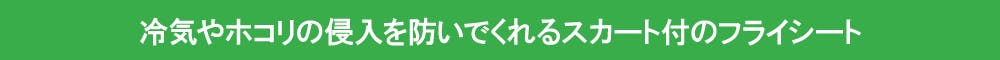 フライシートには全周にスカートが装着されています。ルーム内を寒さから守り、暑い時期はインナーテントの通気やサイドベンチレーション部分に風が入るよう、束ねて留めることもできます。