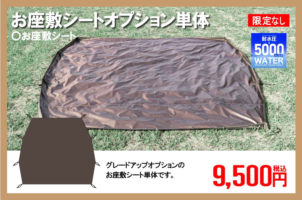 フライシートも設置が簡単なうえ、収納可能なシェードを前室に装備しているので展開すればリビングはさらに広々と解放感が得られてタープも不要。また強い日差しや、急な雨などにキャンプ道具をさらしてしまうこともなくて安心です。広いリビングを和室のように、もしくは靴を脱いでゆったりとしたロースタイルで使えるオプションのお座敷シートが用意されています。