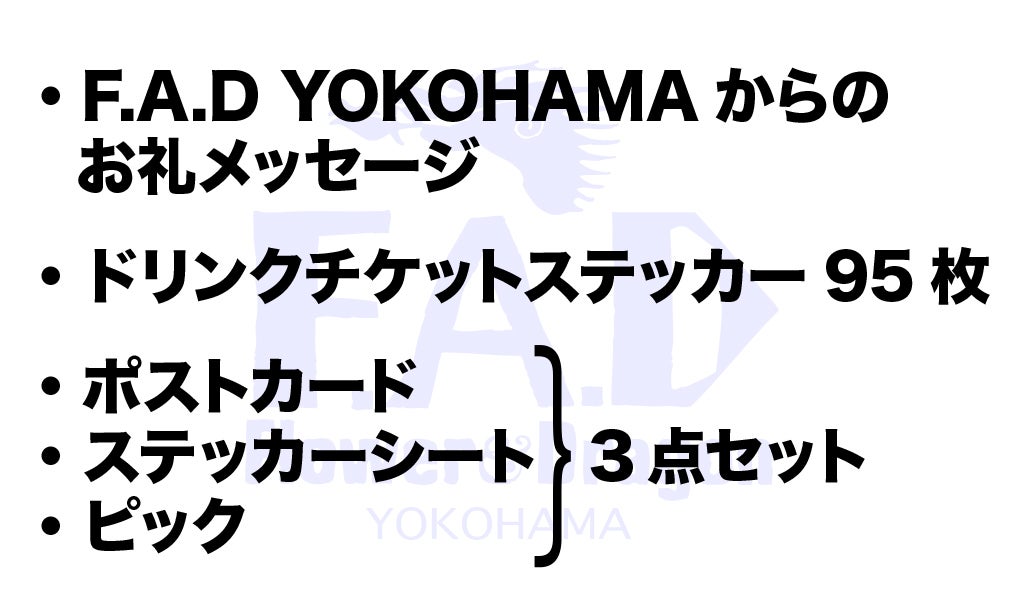F.A.D YOKOHAMAロゴの入ったオリジナルポストカード,オリジナルピック,オリジナルステッカーシートになります。