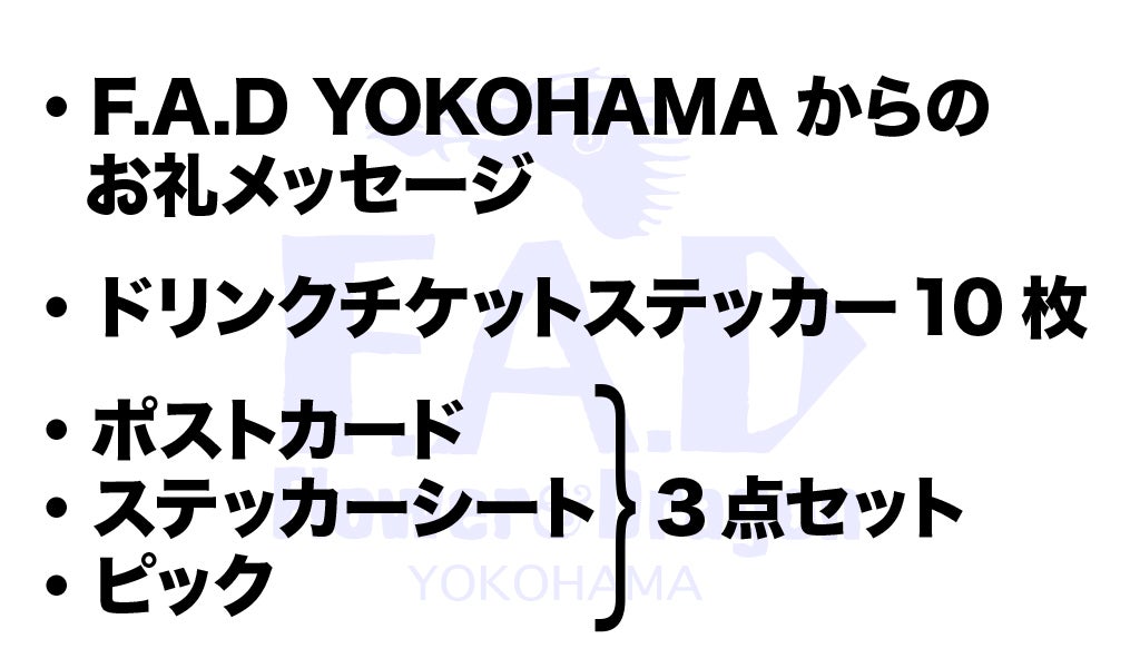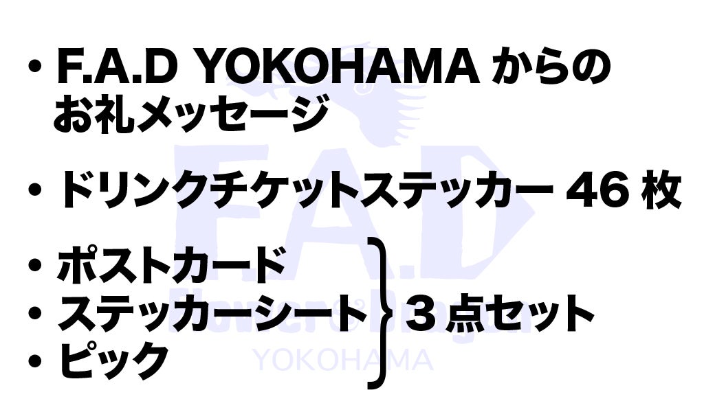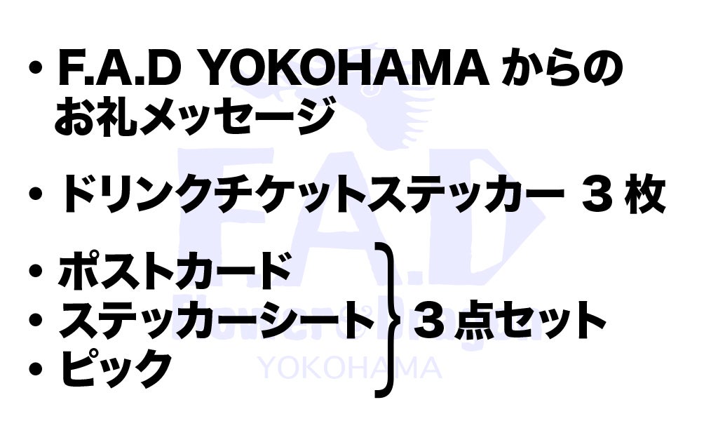 F.A.D YOKOHAMAロゴの入ったオリジナルポストカード,オリジナルピック,オリジナルステッカーシートになります。