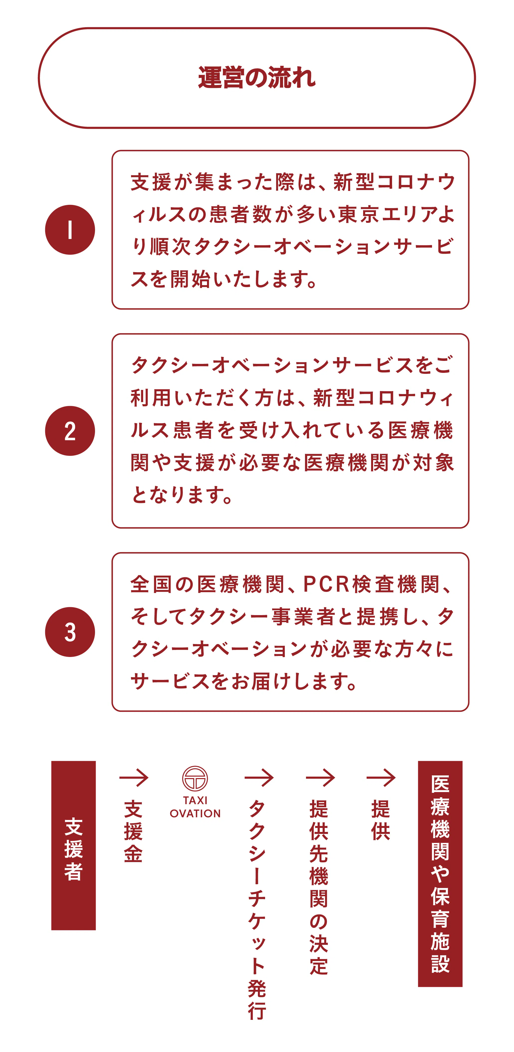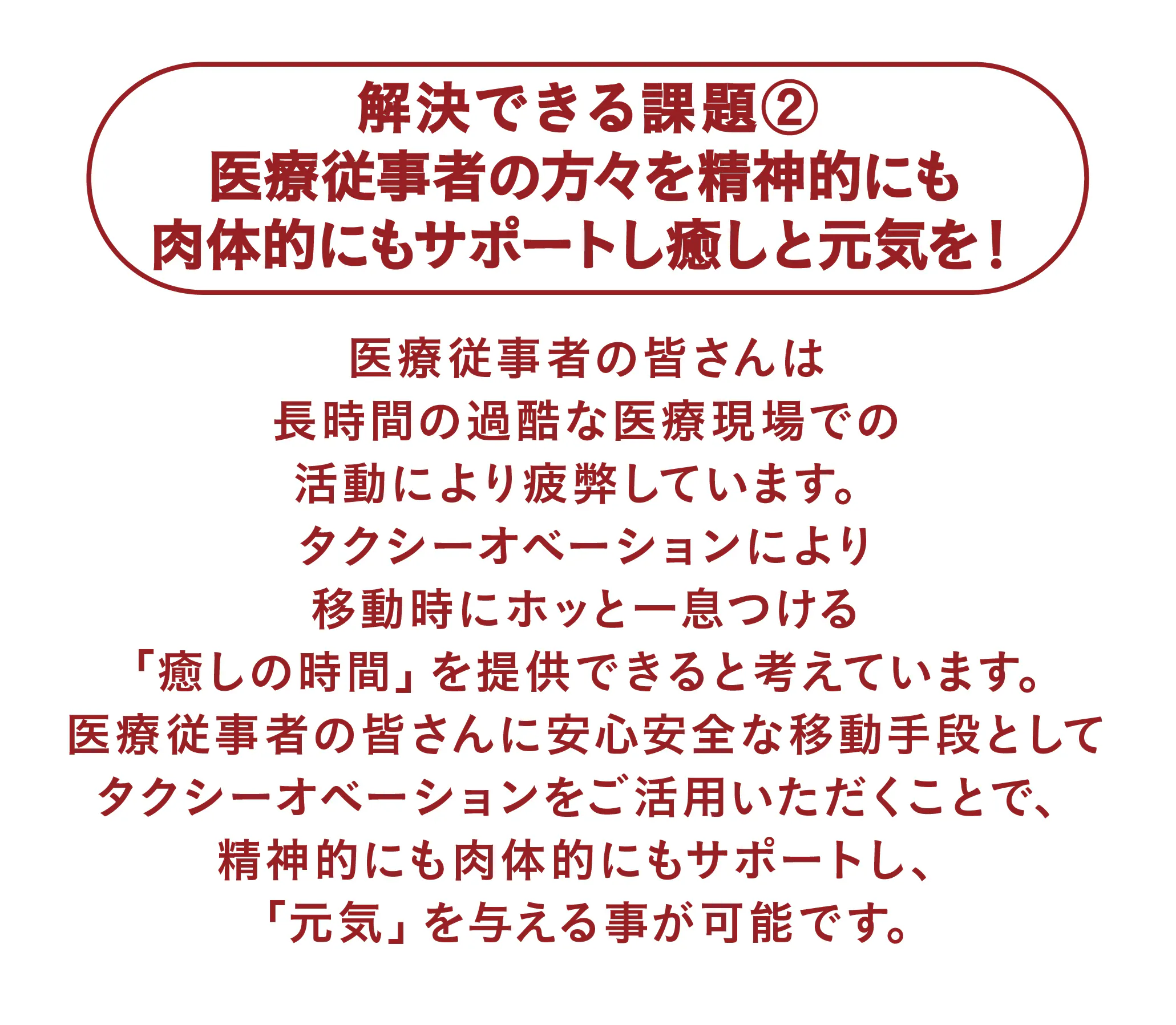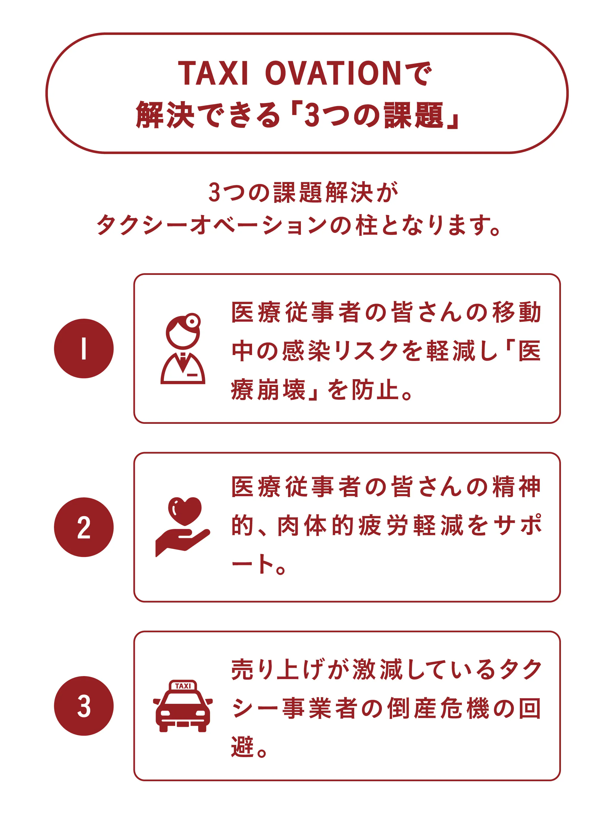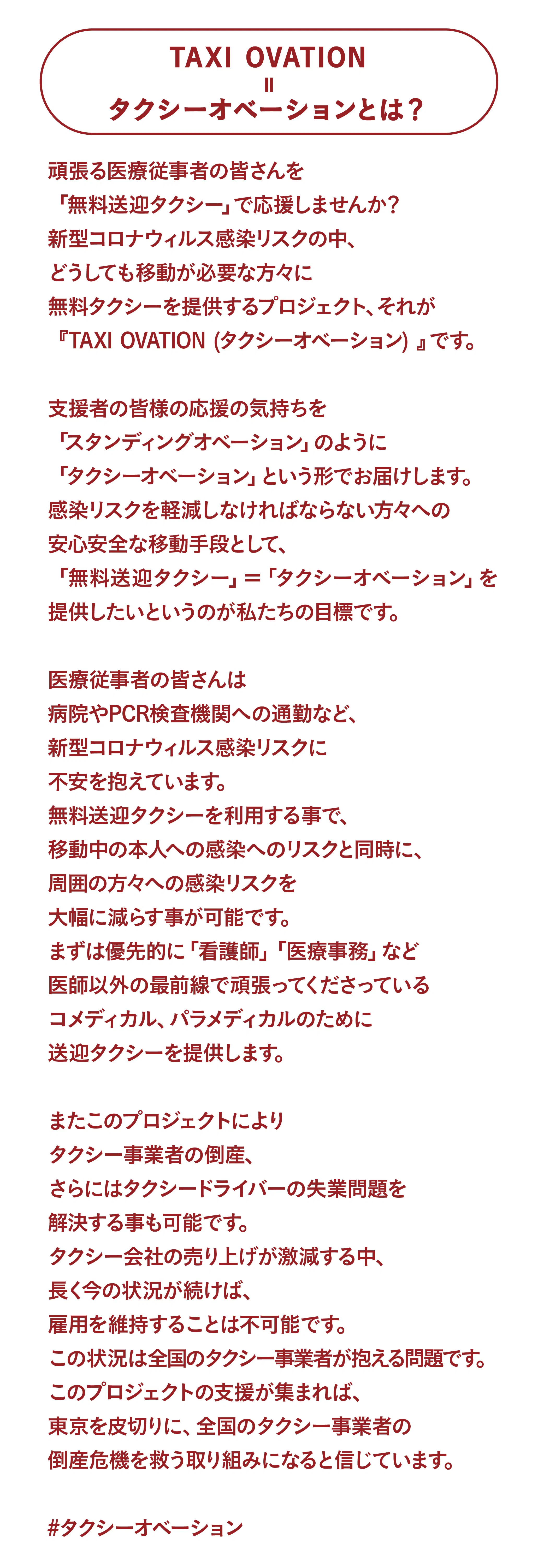 医療従事者の皆さんに「希望」や「勇気」や「癒し」を届けるだけでなく、タクシー事業者のサポートができる。それがタクシーオベーションです。