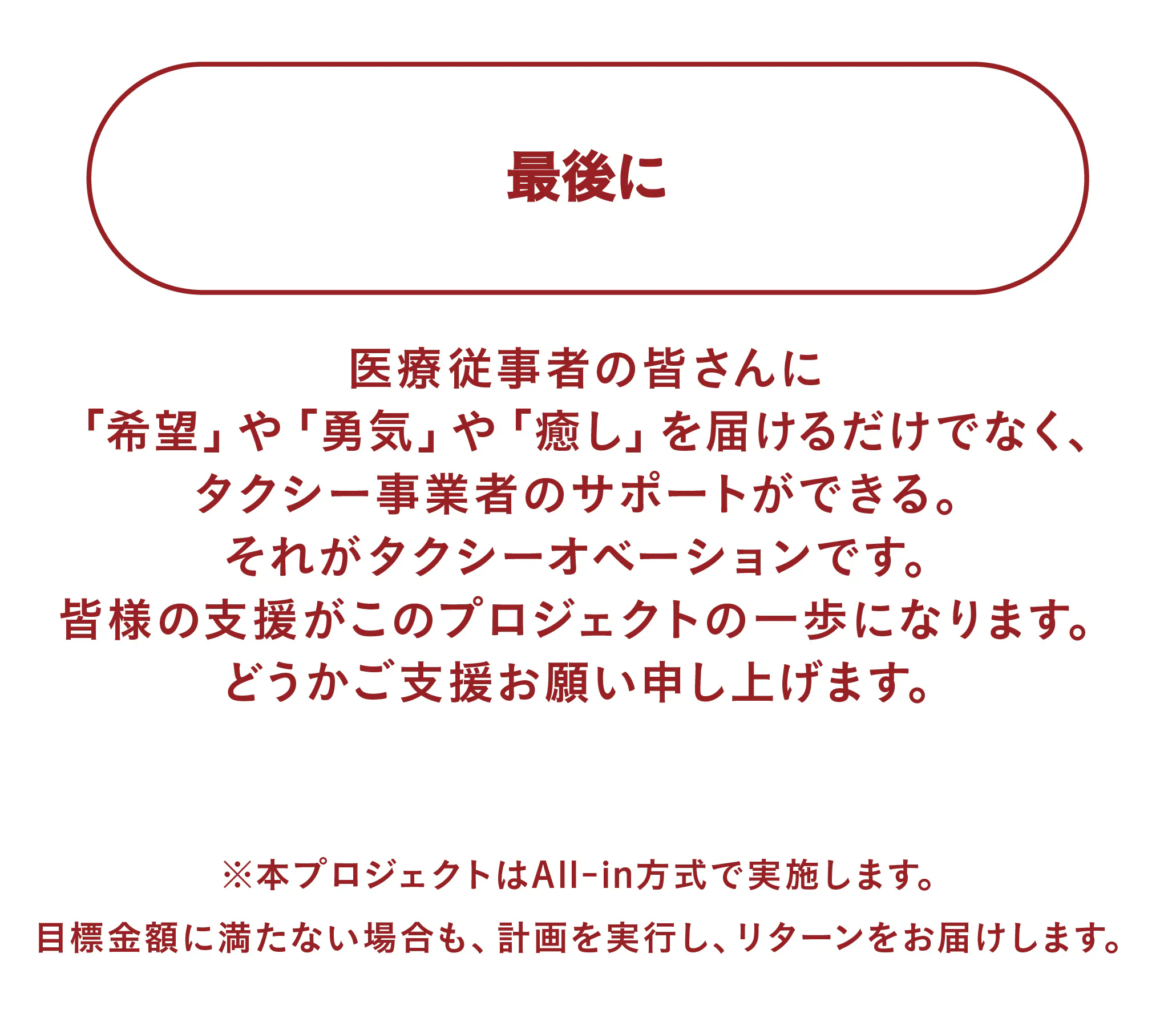 2020/05/31 12:12本日でタクシーオベーションへの支援募集が終了いたします。1ヶ月間のプロジェクトでしたが、皆様のご支援のおかげで医療従事者の皆さまへの無料送迎タクシーを運行することが出来ました。今、介護施設も含めてサポートが必要な施設との連携を進めております。活動の内容はこちらの活動報告に掲載予定でございます。温かいご支援本当にありがとうございました。 もっと見る
