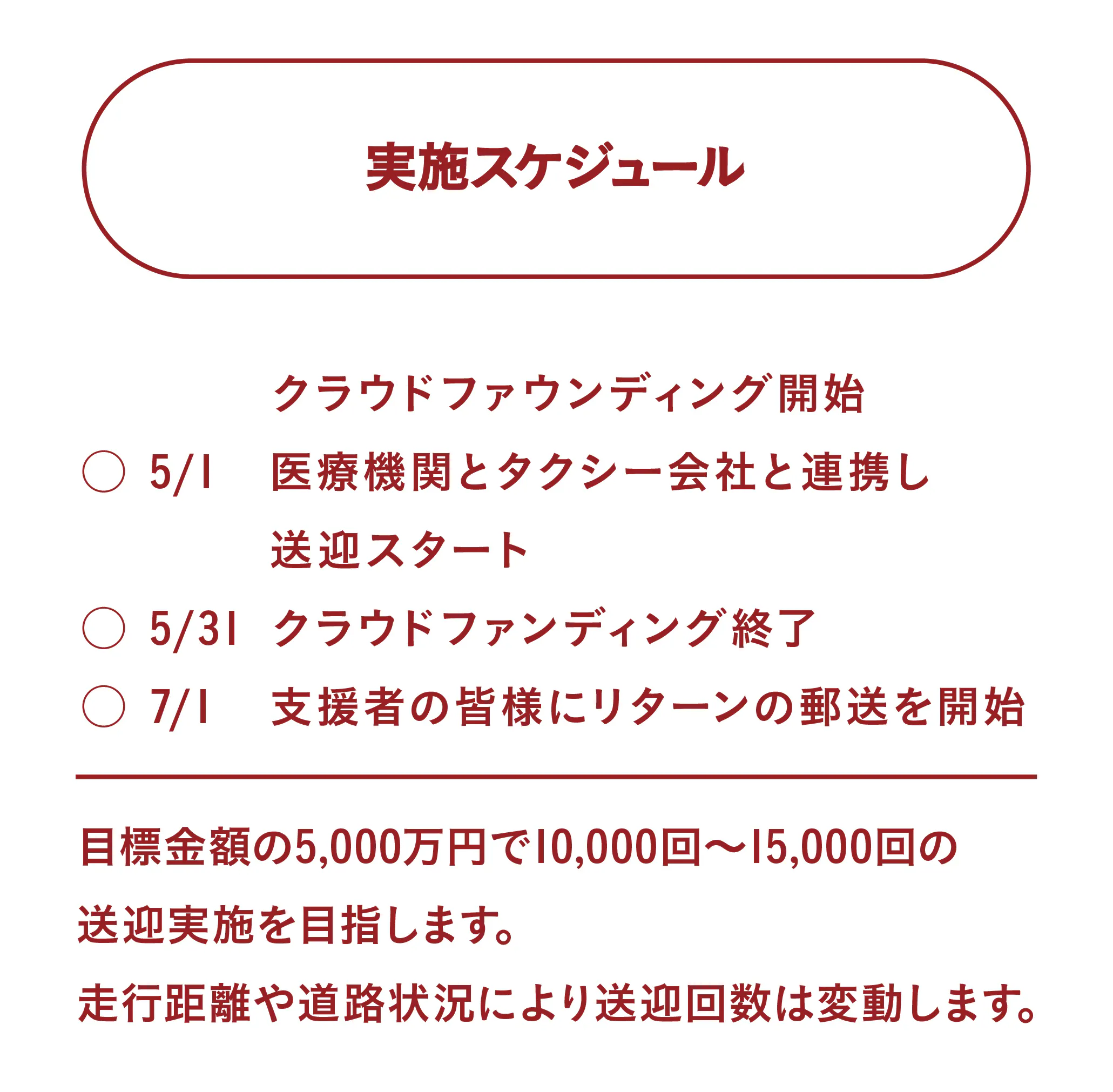 For this initial fundraiser, we have partnered with Makita General Hospital and the taxi companies Condor Magome Kotsu Co., Ltd. and Kyoritsu Taxi Co., Ltd.