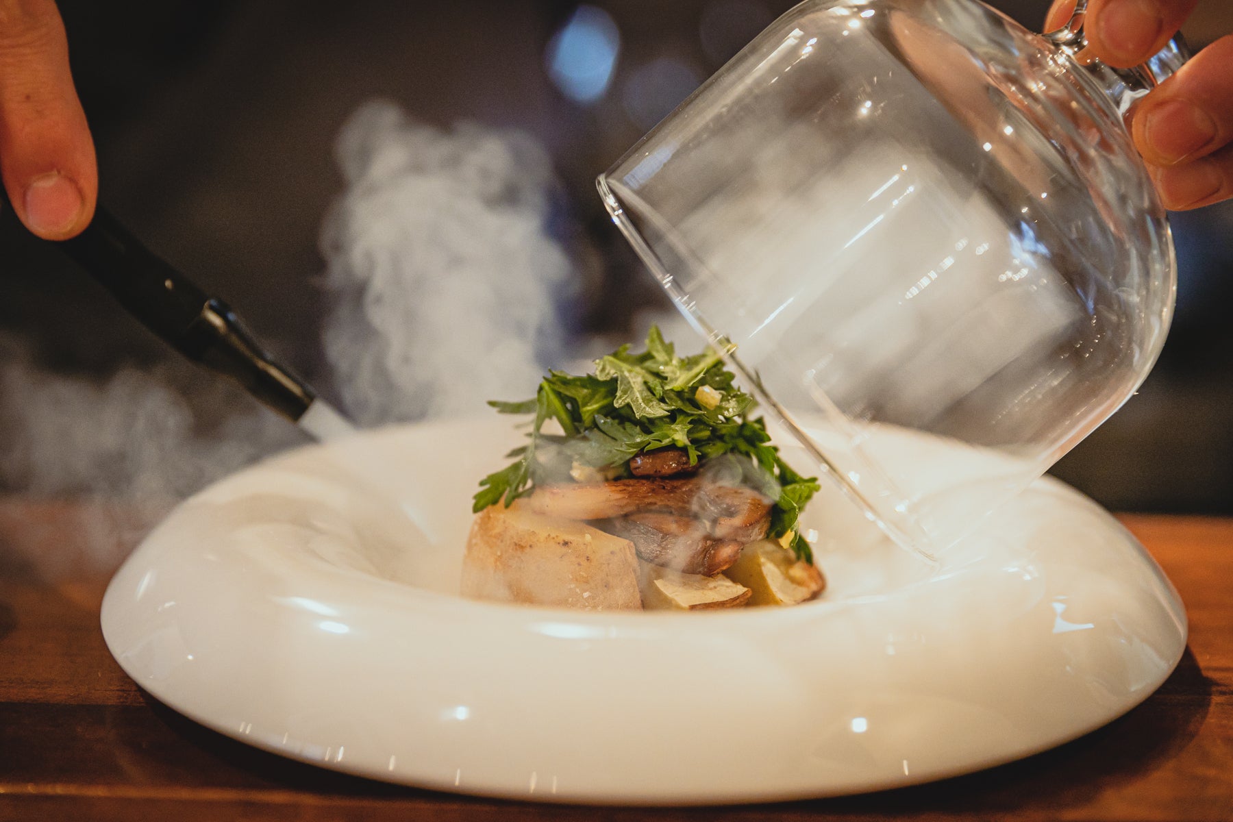 ⑦18カ月熟成させたメークイーンと虎王椎茸のソテー・春菊とレモンのコンフィのスモーク仕立て