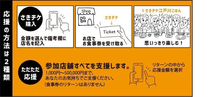 つまり、皆様がさきチケを購入することが、皆様が応援したいと思っている江戸川区の飲食店を直接支援することに繋がるのです。