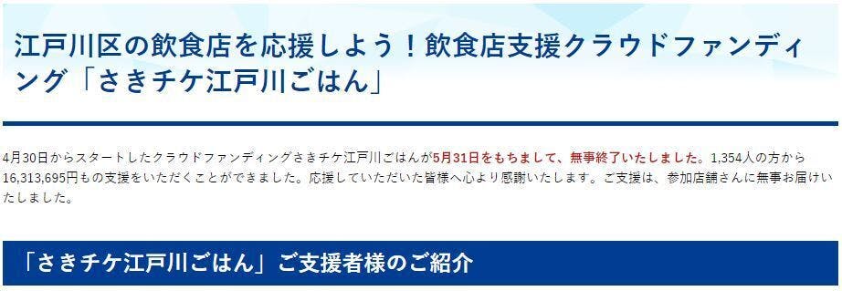 2020年4月30日よりスタートした、江戸川区の飲食店応援プロジェクト『さきチケ江戸川ごはん』は、5月31日をもちまして募集期間を終えました。プロジェクトの結果を以下の通りご報告いたします。支援総額 16,313,695円支援者数 1,354人目標達成率 326%1か月間という短い期間にも関わ...