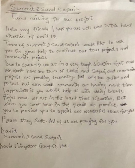 こんにちは。キリマンジャロのツアー・プロジェクト(Summit 2 Sand Safaris by David Livingstone)の社長Davidとボランティアの菅谷です。COVID-19の影響で運営継続が困難な状況であるため、プロジェクトを立ち上げることにしました。会社とプロジェクト紹介(日本語)はこちらをご覧ください。
