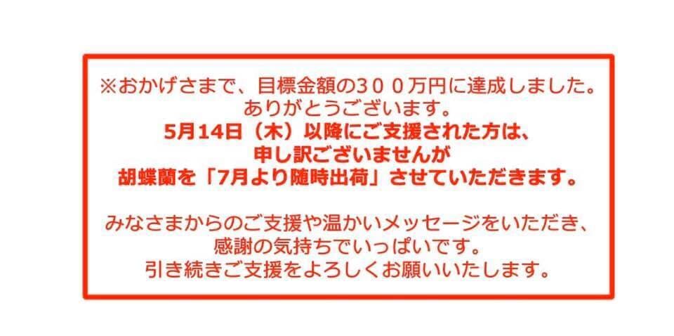 2020/05/17 11:13皆さまのお陰で目標金額300万円を達成しました。6月出荷を控えているにも関わらず行き場が決まっていなかった胡蝶蘭のお届先が全て決まりました。この場をお借りして御礼申し上げます。6月のフラワーロスが全て回避できました。5月14日以降にご支援のお申込みをして頂いた支援者様のリターンのお届けは7月となります。何卒宜しくお願い申し上げます。新型コロナの状況は7月はどうなっているのか?正直わかりません、しかしながら経済がコロナ以前の状況に戻っていることはないと考えております。引き続きご支援を頂ければ幸いです。 もっと見るテレビ朝日スーパーJチャンネルで紹介されました