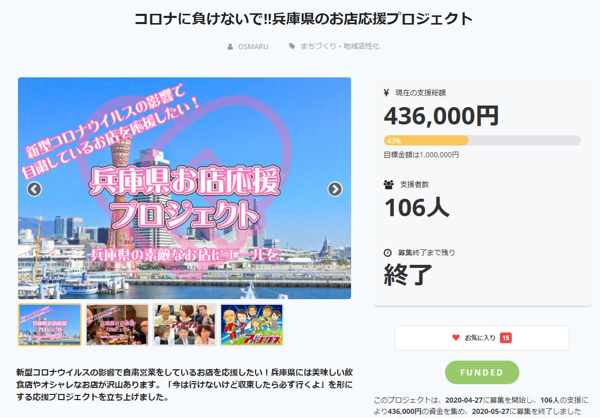 2020/05/28 16:08兵庫県お店応援プロジェクトをご支援いただきありがとうございました。106人の方から温かいご支援をいただくことができました。お預かりした支援金は責任を持って店舗様にお届けいたします。本当にありがとうございました。6月から第2期募集を開始いたします。第2期は既に三田市の後援をいただいており、神戸市、兵庫県に後援申請をおこなっております。兵庫県、神戸市、三田市の後援の元、新たにスタートを切ります。所属している商工会にも後援のお願いに伺う予定です。また、現参加店舗に加え、新たに参加される店舗の募集を開始をいたしました。より多くのお店のオーナーさんに元気になってもらえるよう、活動を続けてまいりますので、今後とも宜しくお願いいたします。兵庫県お店応援実行委員会代表 丸井保明副代表 弘田弥生石田佐知子黒木誠二後藤佳宏照山美希小山田光正 もっと見る