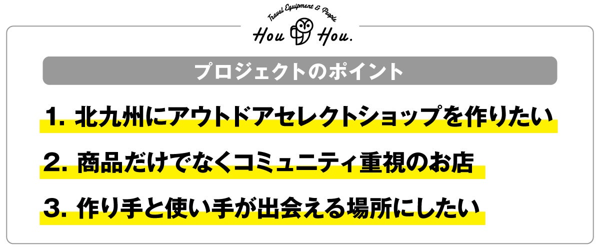 このプロジェクトでは私たち夫婦が立ち上げる「旅道具と人 HouHou(ホウホウ)」という店舗の改装・設備費用を支援いただきたいと思います。このお店は普通のアウトドアショップとは違ったものにしたいと考え、私が今までに人と関わることで生まれた気づきや、場作りの仕掛けをいくつか盛り込んでいます。
