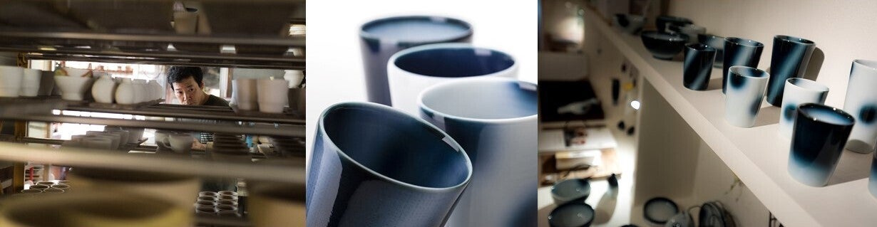 ひときわ目を引く、青のグラデーション。独自の調合で作られた、やや緑がかったこの青色は「ヨシュアブルー」と呼ばれ、一つ一つの器にエアーブラシで吹き付けられています。この独特のブルーに惹かれてシリーズで揃えられる方も多く、ヨシュア工房の店舗にはこちらの器を目当てに遠方からお越しになる方もいらっしゃいます。今回、「愛媛の良いもので父の日の贈り物選びにお役に立ちたい」想いにご賛同いただき、ビールに最適な磁器タンブラーをセレクトしていただきました。