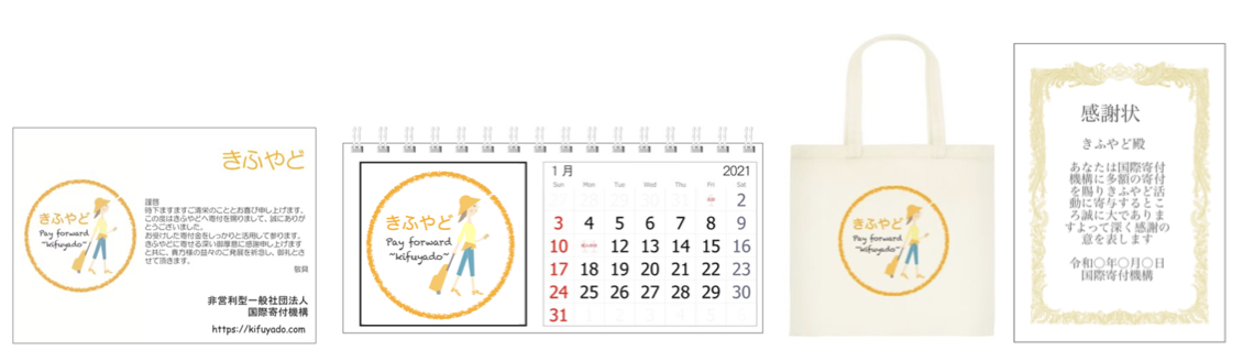 【個人様の場合】感謝状・ポストカード・卓上カレンダー・トートバッグ・きふやどサポーターとしてHPに名前の記載(希望者のみ)