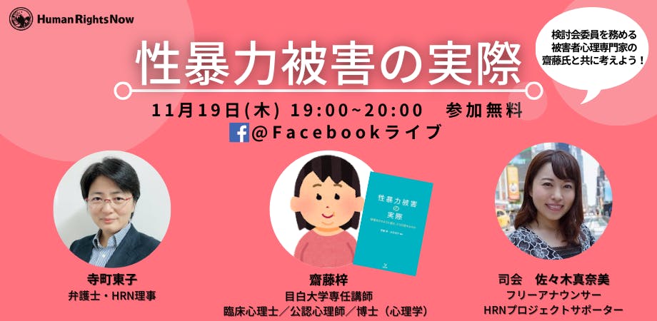2020/11/09 17:20現在法務省で行われている性犯罪に関する刑事法検討会は、11月から、暴行脅迫要件の撤廃や性交同意年齢の引上げ等について、より本格的・具体的な議論に入ります。 被害者に寄り添った刑法改正という課題は、これからがまさに正念場。私たちの声をさらに伝えていく時です。 そこで、より多くの方と語り合う場を作っていきたいと思い、前回好評だったオンライントークイベント第二弾を開催します。 今回のゲストは、目白大学専任講師・臨床心理士・公認心理師・被害者支援都民センター相談員の齋藤梓氏。齋藤氏は、現在法務省で行われている検討会で委員を務めていらっしゃいます。 トークイベントでは、HRN理事の寺町と齋藤氏が対談し、性暴力被害の実際と刑法性犯罪規定のギャップについて考えます。齋藤氏の著書「性暴力被害の実際」制作の裏側、検討会の状況についてもお話する予定です。* * *日時:2020年11月19日 (木) 19:00-20:00開催方法:Facebookライブ (peatixでご登録いただいたメールアドレスに、参加URLをお送りします。)参加費:無料お申し込み&詳細:https://wrevent20201119.peatix.com※登壇者への質問は締め切りました。当日ライブ配信中にも質疑応答の時間を設けております。 出演:齋藤梓氏(目白大学専任講師、臨床心理士/公認心理師/博士(心理学))寺町東子(弁護士・HRN理事)司会 佐々木真奈美(フリーアナウンサー・HRNプロジェクトサポーター)【問い合わせ先】認定NPO法人 ヒューマンライツ・ナウ 事務局(担当:中村)電話:03-6228-1528 Mail: akane.nakamura@hrn.or.jp もっと見る