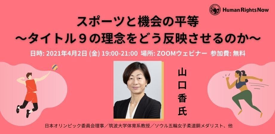 2021/03/30 16:27スポーツにおける男女平等は、あらゆる点で遅れている。中学校以降、女子のスポーツと男子のスポーツが明確に分離され、スポーツにおける男性中心主義が教育の現場で貫かれています。ヒューマンライツ・ナウ(HRN)では、「日本の教育機関における男女平等の推進」に関する報告書(【報告書】日本の教育機関における男女平等の推進 | ヒューマンライツ・ナウ (hrn.or.jp))を2021年1月に公表しました。同報告書は、アメリカ合衆国の連邦法で、学校における男女平等を目指すタイトル・ナインのような法整備を行うことを提言しています。日本版タイトル・ナインの実現のために、今回JOC理事で筑波大学教授の山口香さんをお迎えして、タイトル・ナインが主にその対象としているスポーツにおける男女平等を推進するための方策を考えます。皆様のご参加をお待ちしております。「スポーツと機会の平等 ータイトル9の理念をどう反映させるのかー」(主催:ヒューマンライツ・ナウ)日時:2021年4月2日(金) 19時から21時開催方法:Zoomウェビナー(Googleフォームでご登録いただいたメールアドレスに、参加URLをお送りします。)参加費:無料内容:スポーツと機会の平等:山口香タイトル・ナインと教育機関における男女平等:後藤弘子(HRN副理事長・千葉大学教授)教育機関におけると暴力と男女平等:三浦まり(HRN理事・上智大学教授)お申し込み:下記リンクよりフォームにご登録ください。(登録期限:4月2日正午)https://docs.google.com/forms/d/e/1FAIpQLSdeSW163LmW30PUAdh_anpnM7-lR2cxhnUoiqAQY3CFz7gVBw/viewformゲストスピーカー:山口 香(日本オリンピック委員会理事・筑波大学教授)【問い合わせ先】認定NPO法人 ヒューマンライツ・ナウ 事務局Email: info@hrn.or.jpWeb: https://hrn.or.jp/ もっと見る