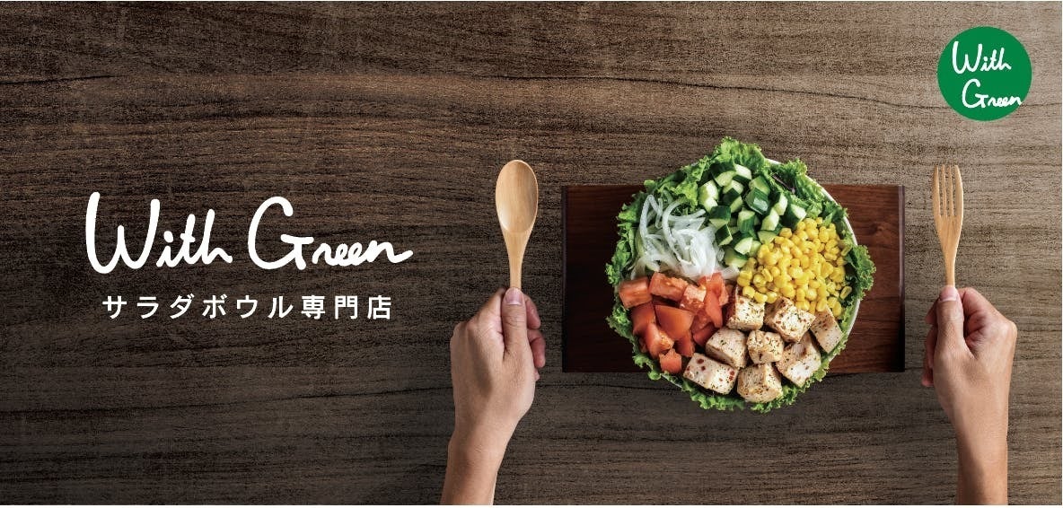 『WithGreen』は、お客様自身がその日の気分や体調にあわせて、野菜・お肉・玄米等の様々なトッピングやドレッシングをセレクトいただくサラダボウル専門店です。ひとつのサラダでバランスよく栄養が取れ、お腹も充分に満たせるボリュームが特徴です。