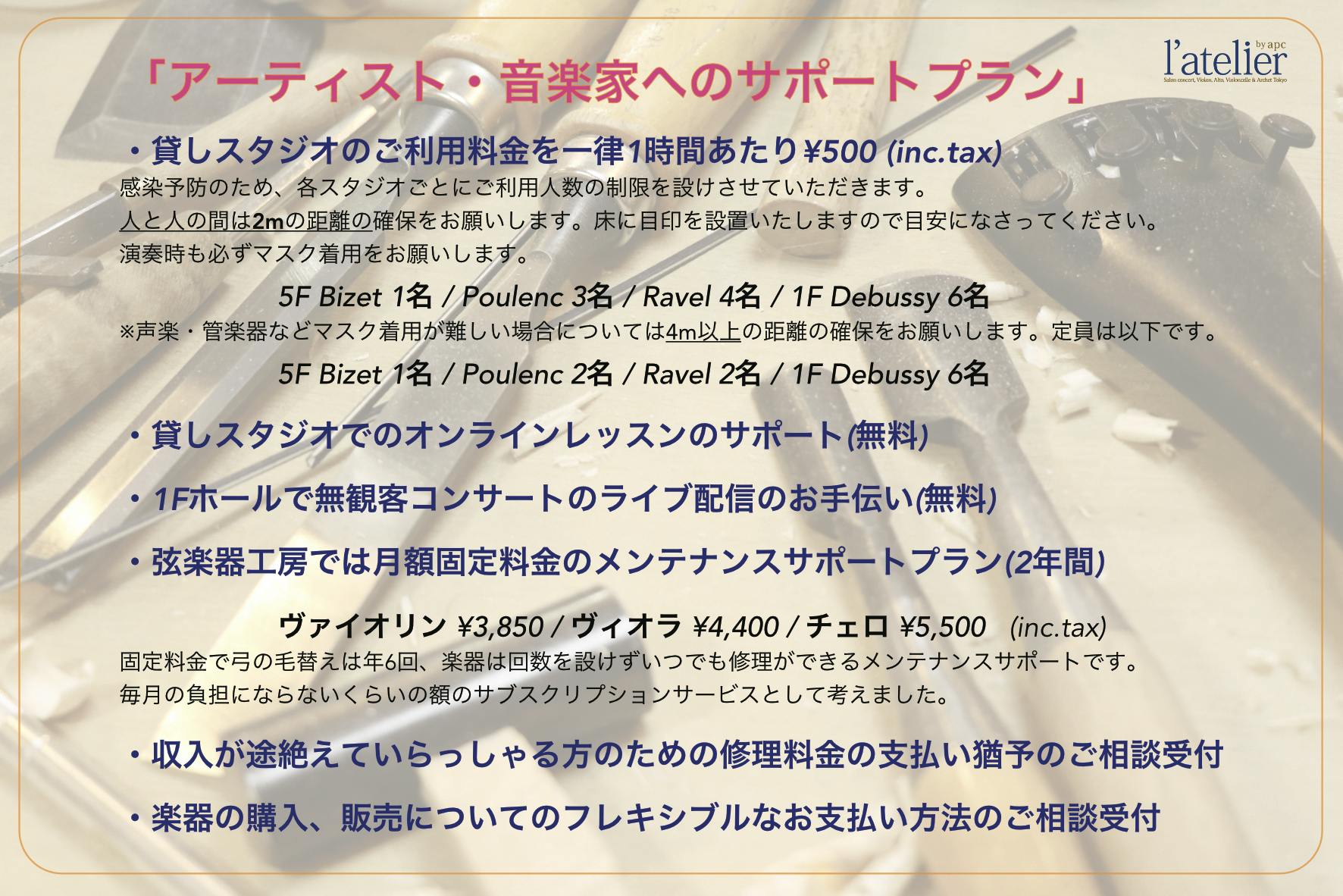 2020/07/22 11:01「アートと音楽を支え続けたい!渋谷サロンホール支援プロジェクト」プロジェクト終了まであと1週間となりました!5、6月はアーティスト・音楽家の皆様へのサポートプランを多くのお客様にご活用いただくことができました! 7月はリハーサルや1対1のレッスンでしたらいつでも通常料金の半額でご利用いただける料金体制で、アーティスト・音楽家の皆様へのサポートを続けることができております。ひとえに皆様のあたたかいご支援のおかげと、心よりお礼申し上げます。またお店にお越しいただかなくても弦楽器店のオンライン試奏ができたり、オンラインショップでのお買い物ができるようにしたり、楽器修理のサブスクリプションサービス「メンテナンスサポートプラン」にも力を入れております。皆様の音楽活動のお役に立てましたら嬉しい限りです!Online shophttps://www.violinshoplatelierbyapctokyo.comメンテナンスサポートプランhttps://www.violinshoplatelierbyapctokyo.com/maintenance-support-plan終了まで残り1週間、引き続き皆様のプロジェクトのシェア等、ご協力いただけましたら幸いです。ペグキーホルダーや、コースターなども心を込めて製作中ですので楽しみになさっていてください♪それではお体にはくれぐれもお気をつけてお過ごしください。l'atelier by apc原 亜緒衣 もっと見るご支援ありがとうございます!