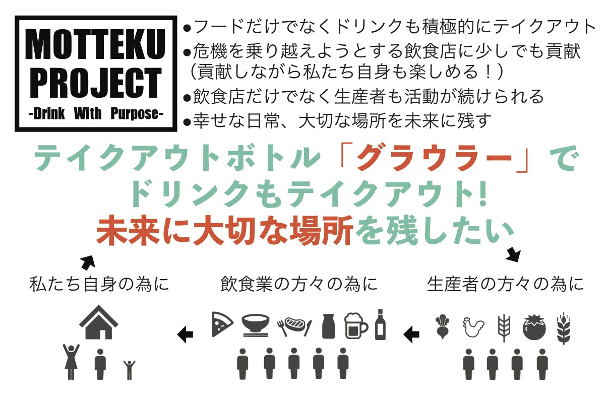 そのような中、ドリンクのテイクアウト(もってく)を沢山の方に行って頂き、飲食店の売上にもっと貢献できればという思いで「MOTTEKUプロジェクト」を立ち上げました。ただ飲み物を美味しく頂くだけでなく、目的を持って美味しく頂く。その目的とは飲食店の危機を救うこと。そして大切な場所を未来に残すこと。