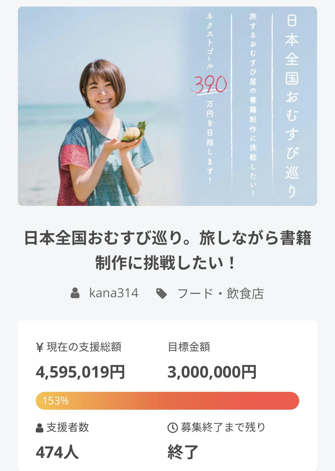 2021/05/13 10:04応援してくださった皆様へクラウドファンディング、無事に終了することができました。4,595,019円のご支援を474名もの方からいただきました。本当に本当にありがとうございます…!ここからがおむすび旅のスタート。私自身が楽しみながら、みなさんに楽しんでもらえる書籍を制作していけるよう頑張ります!!たくさんの方に応援いただきながら企画を進められることが本当に心強いです。旅の様子も随時発信していきますので、チェックしていていただけたら嬉しいです^ ^みなさんのいらっしゃる地域でお会いできますように!今、リターンの準備を全力で進めております。お一人お一人に丁寧にお礼を伝えたくてお手紙を書いており、一部リターンが6月発送になってしまうかもしれません。申し訳ありません。準備完了したリターンから順次発送して参りますので、少々お待ちください。応援本当にありがとうございました。今後ともどうぞよろしくお願いいたします!菅本香菜旅の様子を発信していくInstagramはこちらhttps://www.instagram.com/314.kana/ もっと見る