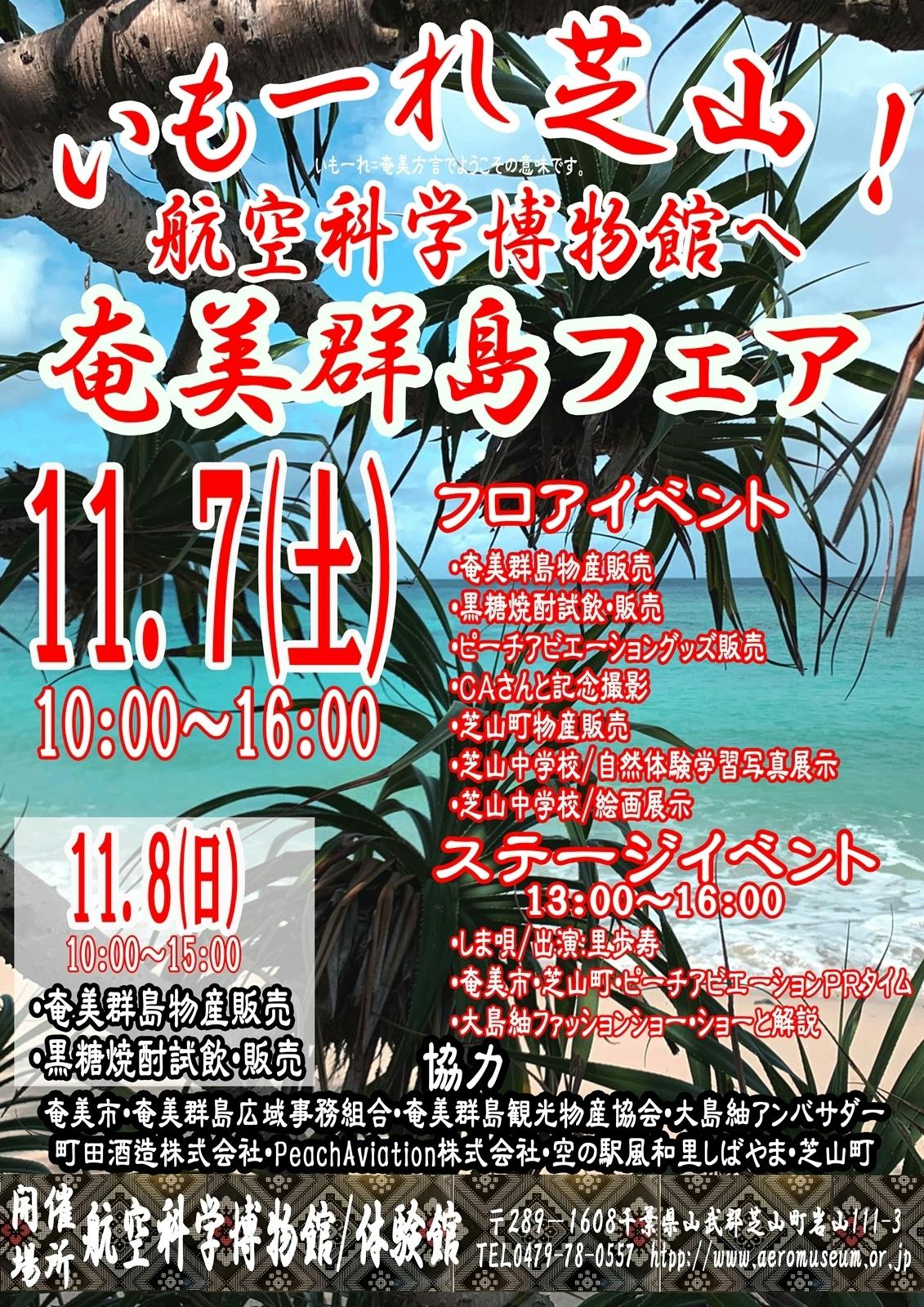 2020/11/03 19:22しばらくの間、活動報告ができず、大変申し訳ありませんでした。先月の報告と致しましては、10月1日から博物館売店にてGoToトラベルの事業として地域共通クーポンの取り扱いを開始し、多くのお客様にご利用いただいております。去る10月23日には「やさしい航空のおはなし パイロットのおはなし」を開催いたしました。当日はお子様から大人まで約100名のお客様に講演を聞いていただきました。 また、今月も様々なイベントを開催予定です。中でも11月7日(土)「いもーれ!芝山 航空科学博物館へ」奄美フェアは初のイベントとなっております。物産販売や試飲会といったフロアイベントのほか13時からは島唄や大島紬のファッションショーなどステージイベントを行います。皆様のご来館をお待ちしております。 もっと見る