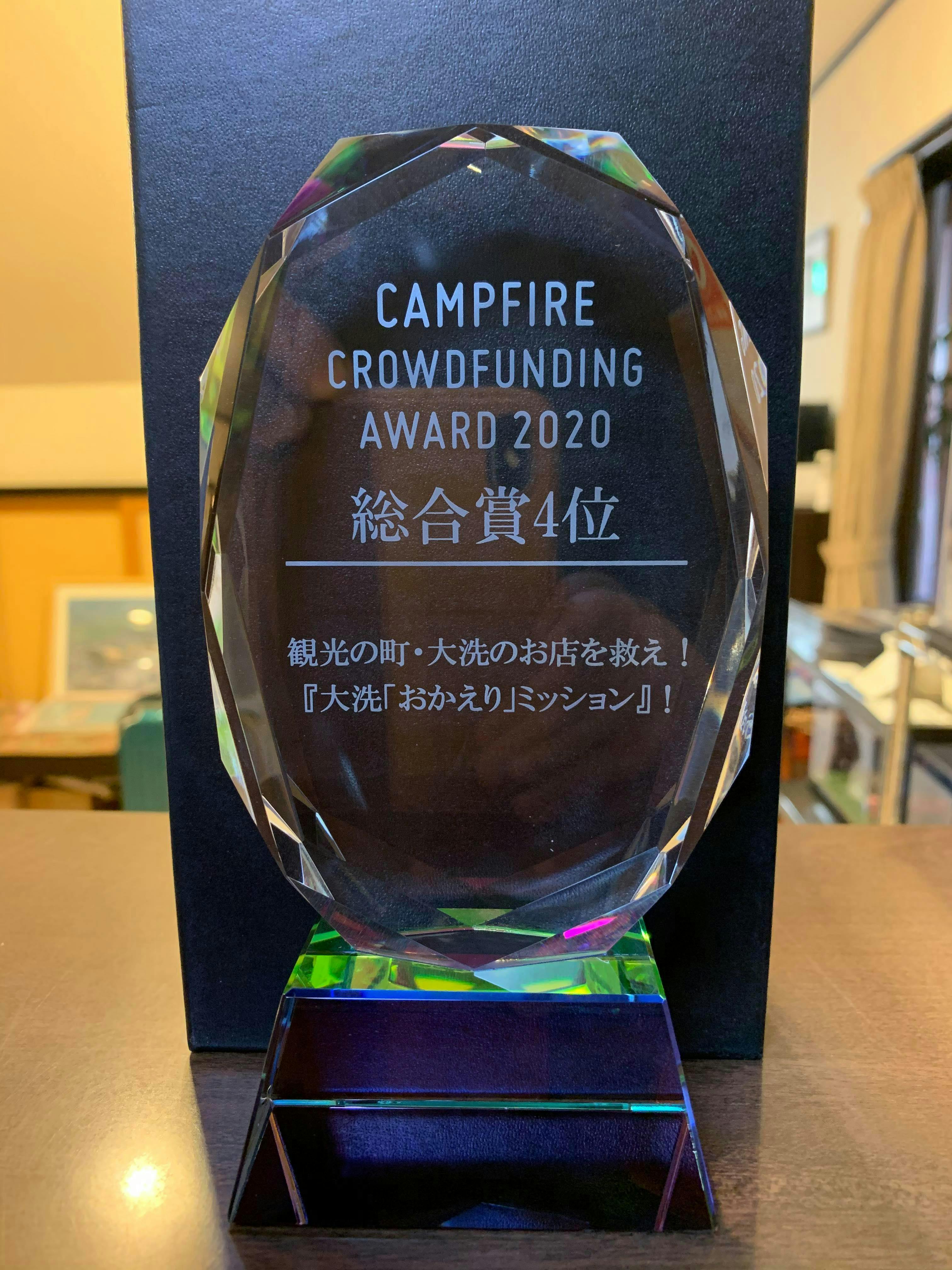 2020/12/23 17:37大洗「おかえり」ミッション!事務局です。昨日行われました「CAMPFIREクラウドファンディングアワード2020」にて、本プロジェクトが「総合賞 第4位」に輝きました!https://award.camp-fire.jp/2020/立派な盾も頂きました。この度、アワードにご投票頂いた方にも感謝申し上げます。誠にありがとうございます。 もっと見る