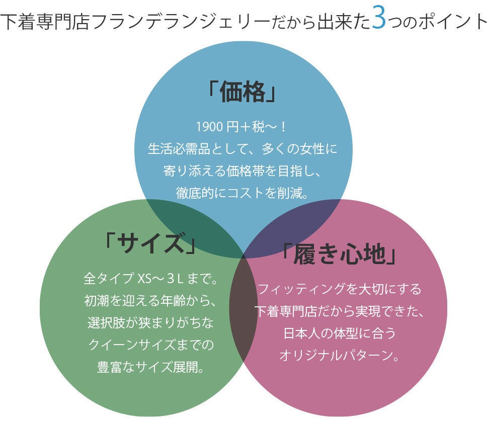 常にお客様の声を聞き、お客様一人ひとりのカラダにあったランジェリーを提供できる企画&接客を心掛けてきたからこそ実現できた3つのポイント「価格」「サイズ」「履き心地」に拘った商品です。